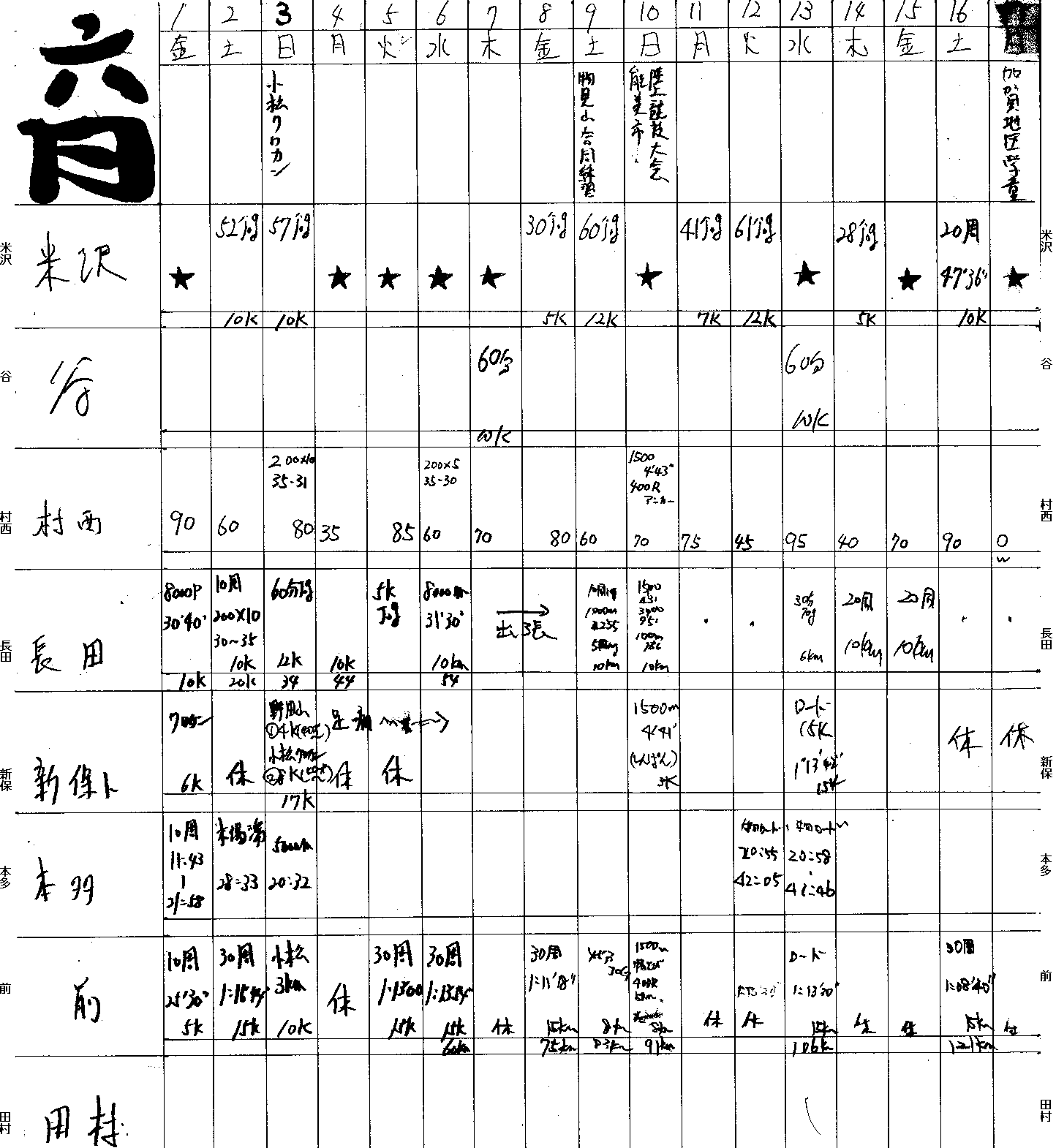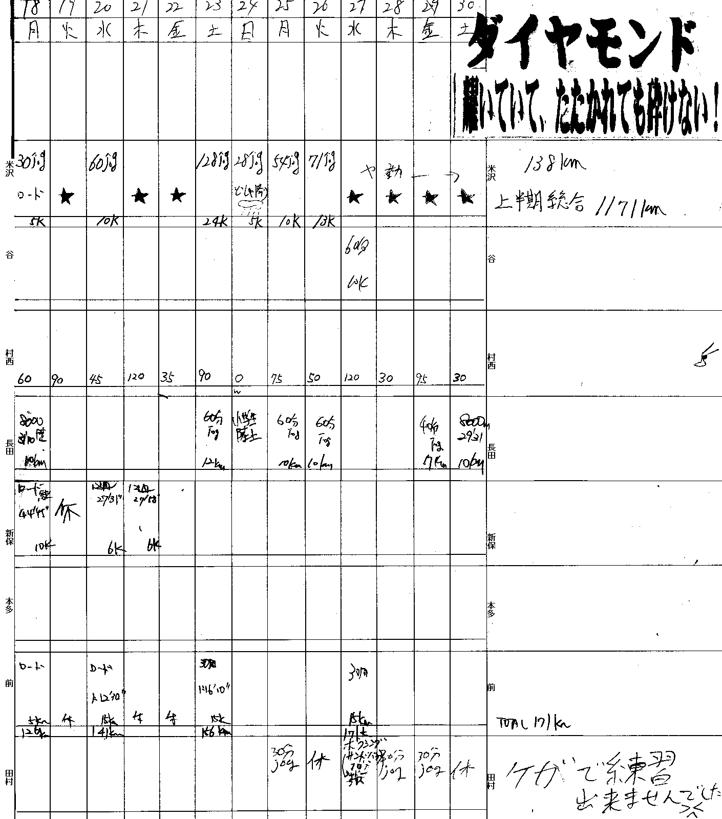| 堂谷 | 5 17'15.16 | 1*5 3'32,27,28,23,18平均3'25.5 1*3 3'35,34,32 平均3'33.4 1*5 3'28,27,27,23,12平均3'23.4 1*5 3'19,17,18,16,13平均3'16.8 | 454km |