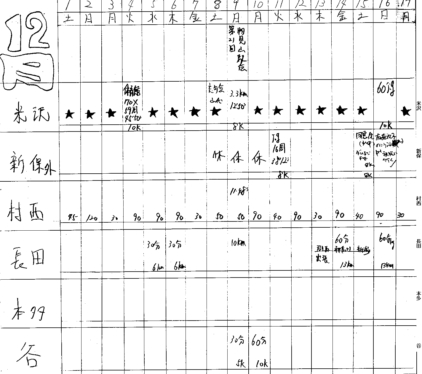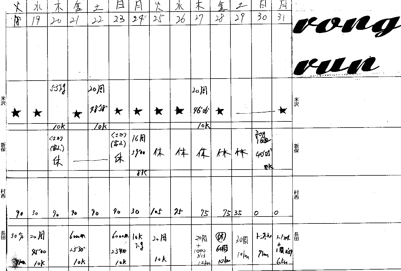 | 順位 | 選手 | 練習量 | 日平均 | 20km以上 | 備考 |