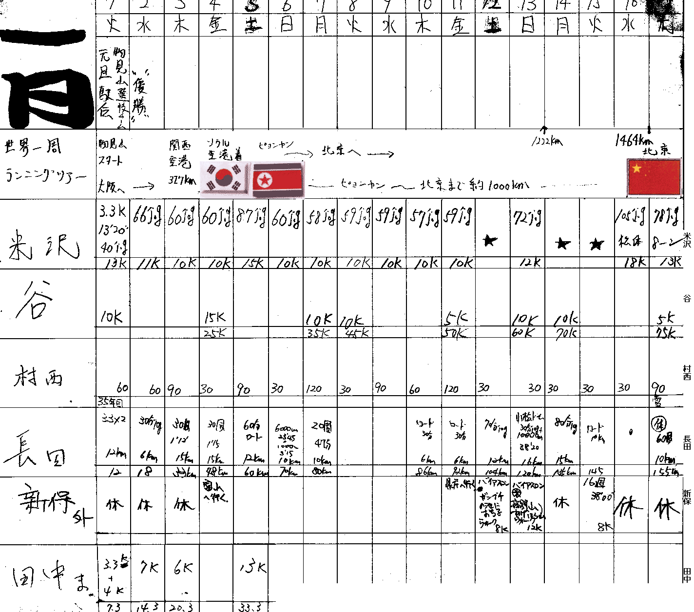 | 世界一周ランニングツアー | 物見山から2562km ルート表 関西空港 大韓民国 北朝鮮 中華人民共和国 モンゴル |