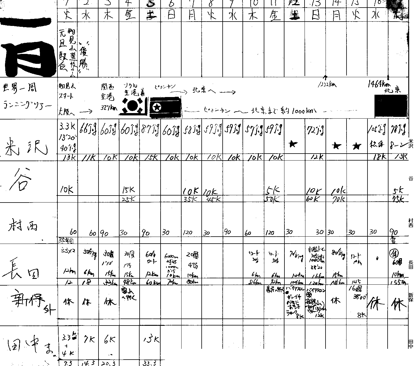 | 順位 | 選手 | 練習量 | 日平均 | 20km以上 | 備考 |