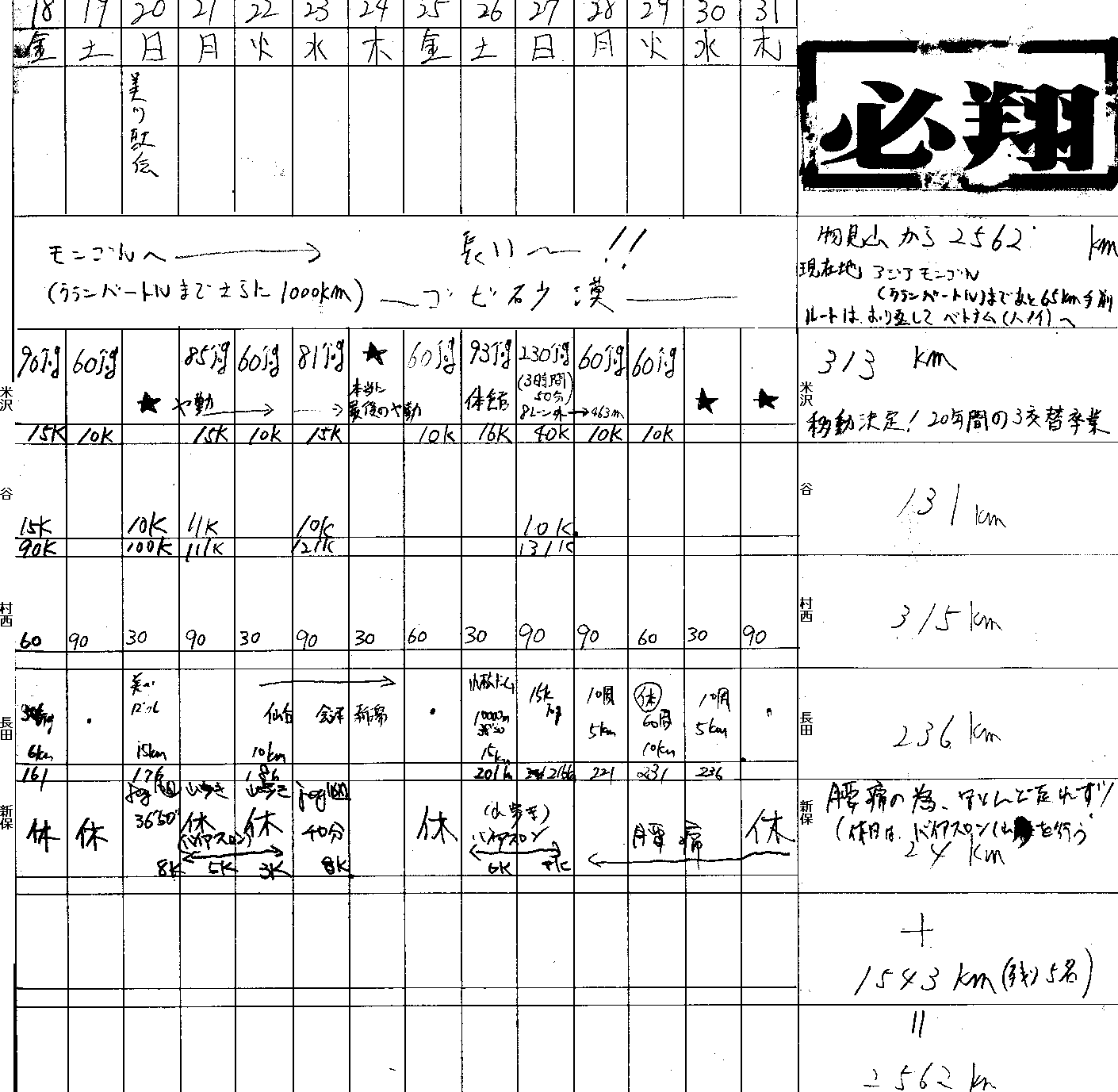 | 2 | 村西 | 1890分 | 61分 | 2日 | 距離換算315km |