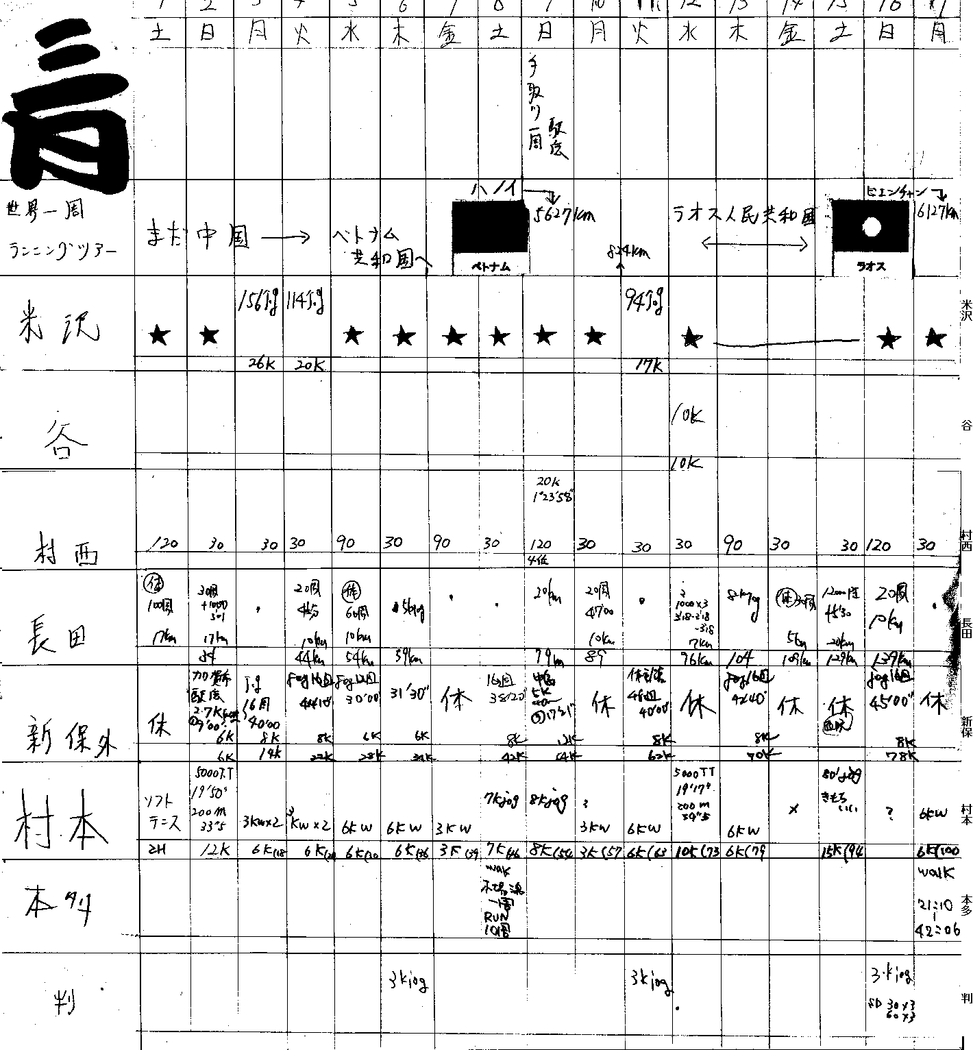 | 順位 | 選手 | 練習量 | 日平均 | 20km以上 | 備考 |
