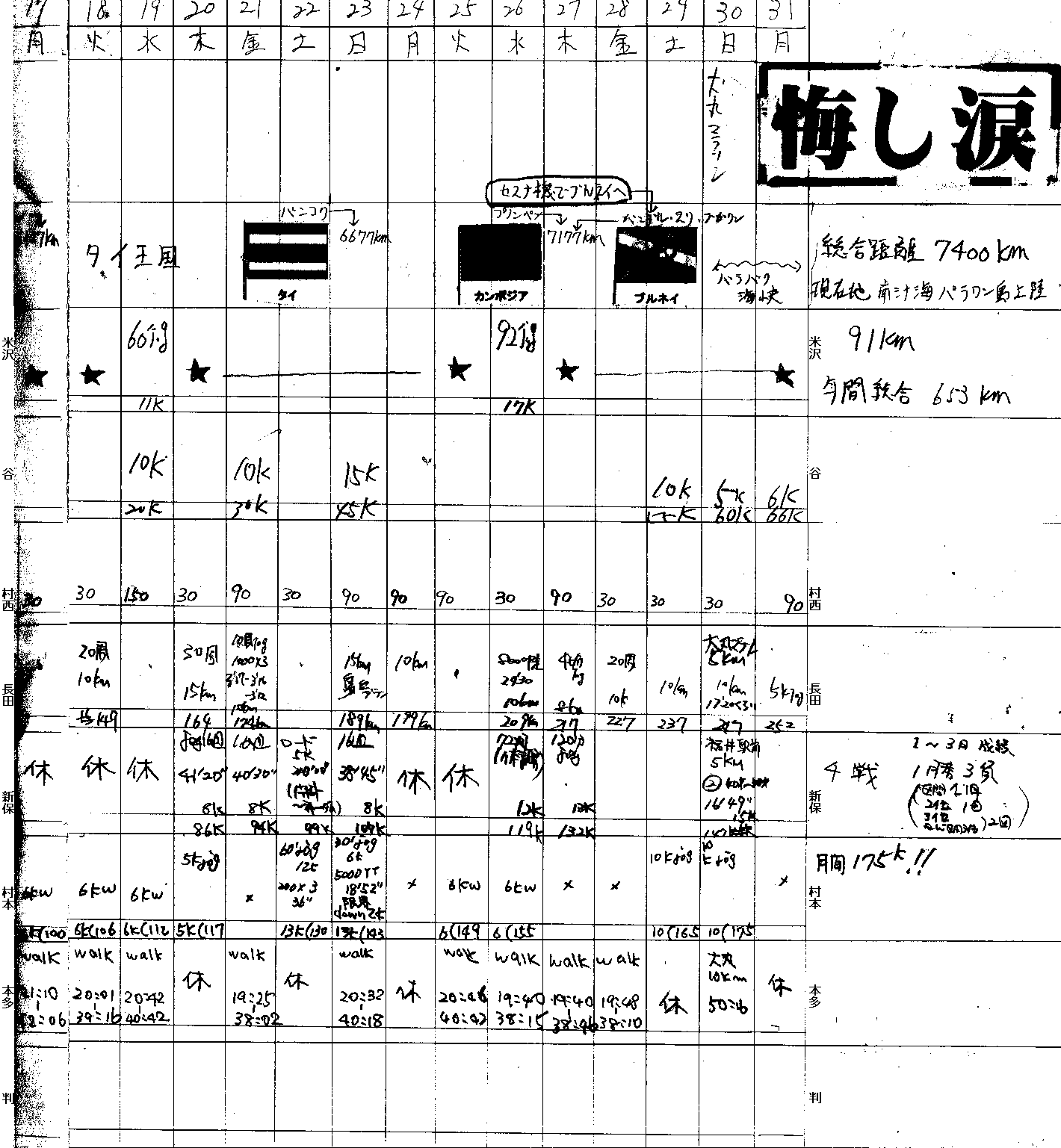 | 世界一周ランニングツアー | 今月2454km 総合7400km | 現在地 南シナ海「バワラン島」上陸 進路はフィリピン島(マニラ)へ |