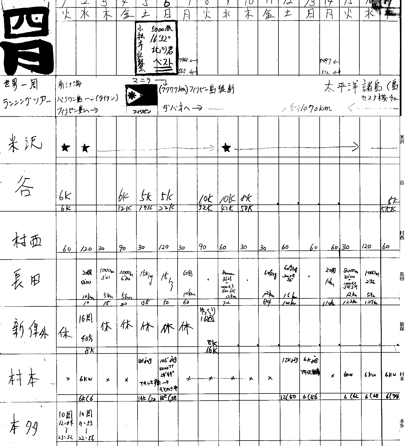 | 長田 | 1.5 4'30.80 | 1 301 1 256 2 634 | 200*15 36 | 8+1*2 30'25+3'20,15 8+1*2 30'00+3'25,15 6+1 22'35+3'20不調 2+1*2 636+3'16,8 ? 10'00 3'01 3'00 | 246km | |