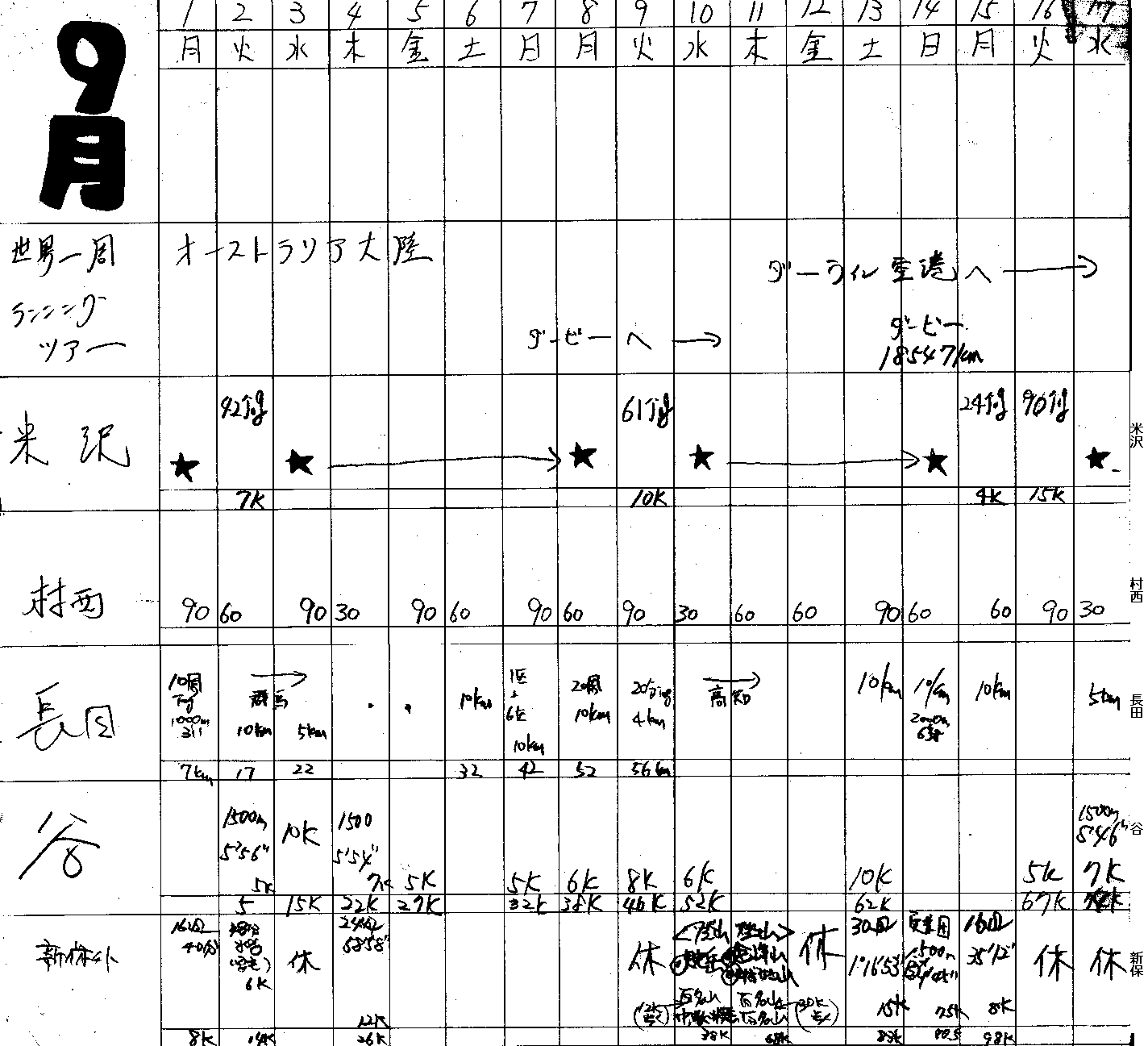 | 堂谷 | 15 4'39.16 3 9'53.37 | 1 3'01.3 1 3'08.1 | 20 74'27 | 4×5 79,77,78,78,71平均76.4 4*10 76,76,76,76,75, 76,76,75,74,71平均75.3 4*10 76,76,75,76,76, 76,75,75,75,69平均74.9 | 1*5 3'21,20,20,19,18平均3'19.6 1*5 3'20,21,20,19,15平均3'18.9 | 451km |
