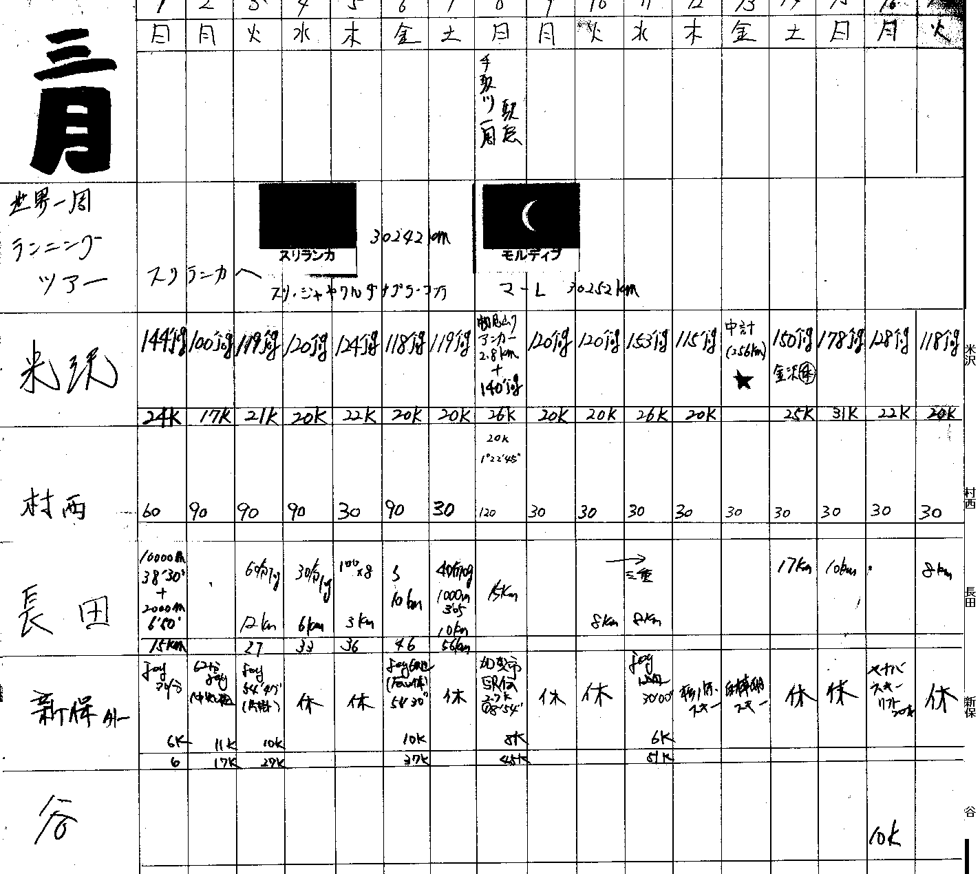 | 順位 | 選手 | 練習量 | 日平均 | 20km以上 | 備考 |