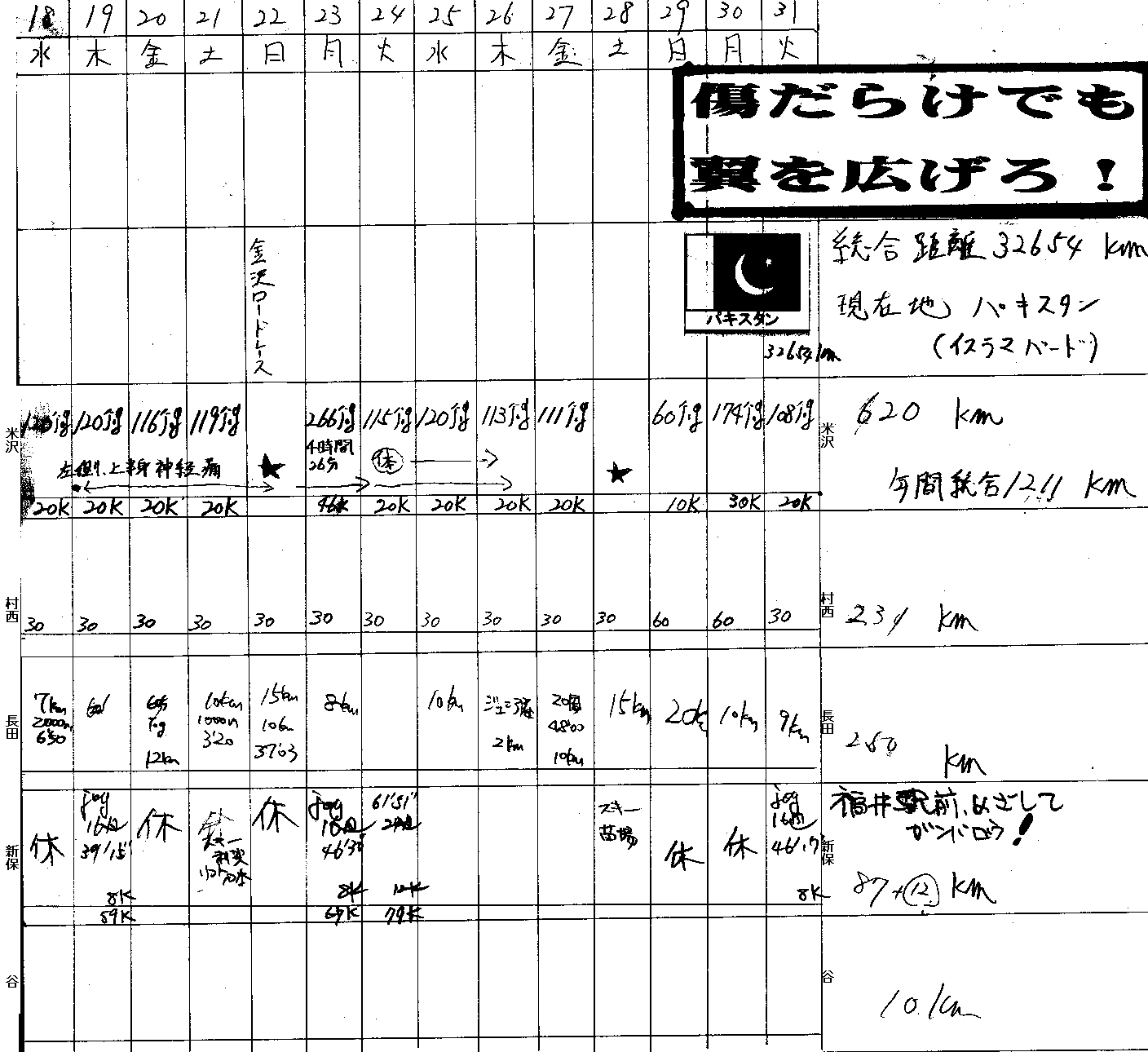 | 4 | 村西 | 1350分 | 44分 | 1日 | 距離換算225km |