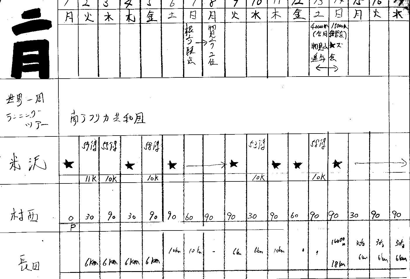 | 順位 | 選手 | 練習量 | 日平均 | 20km以上 | 備考 |
