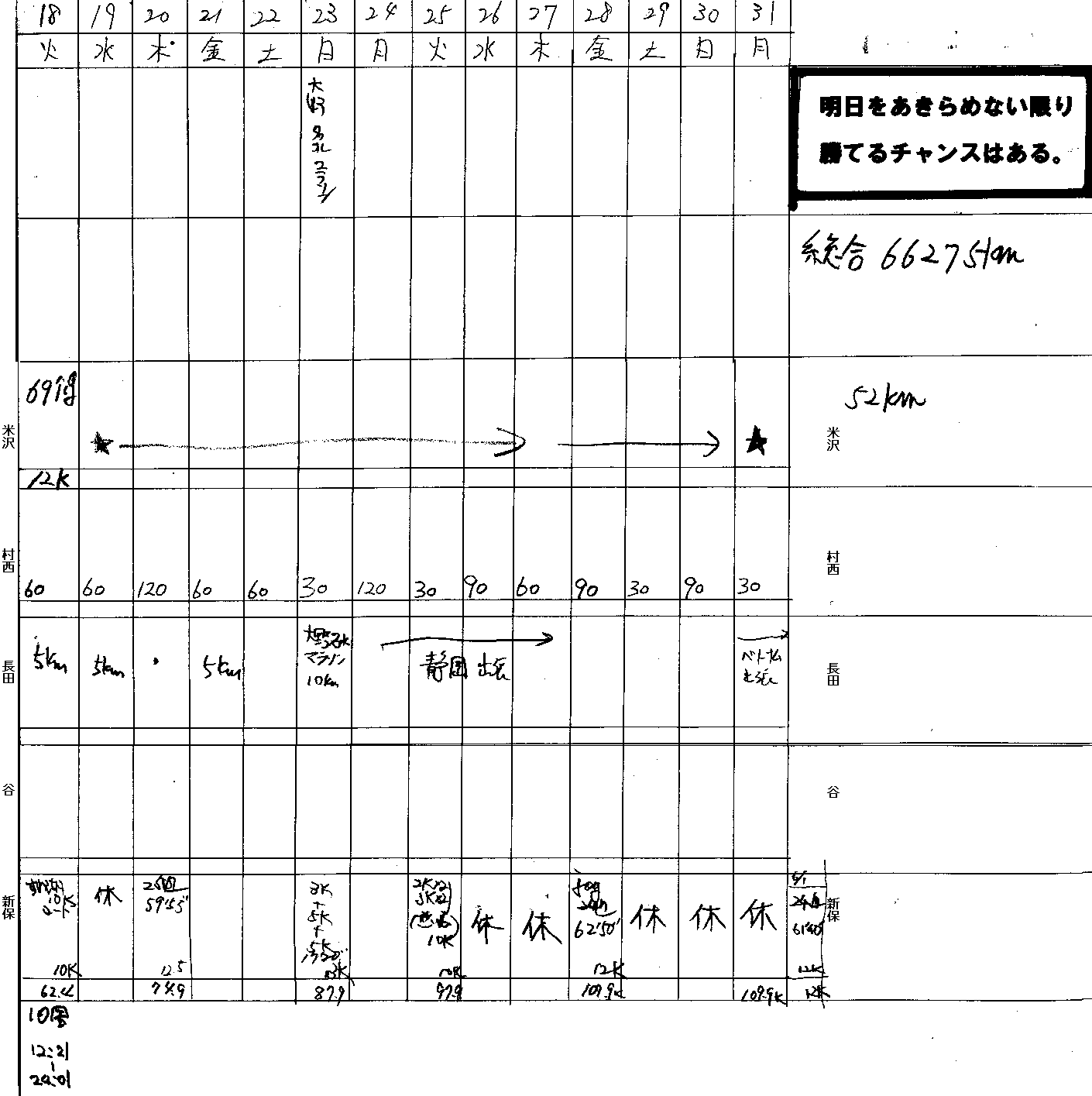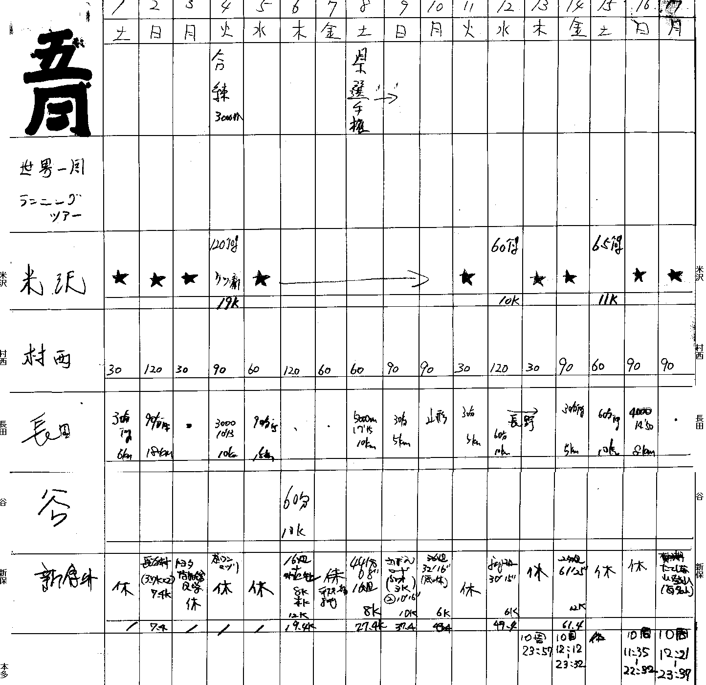| 順位 | 選手 | 練習量 | 日平均 | 20km以上 | 備考 |