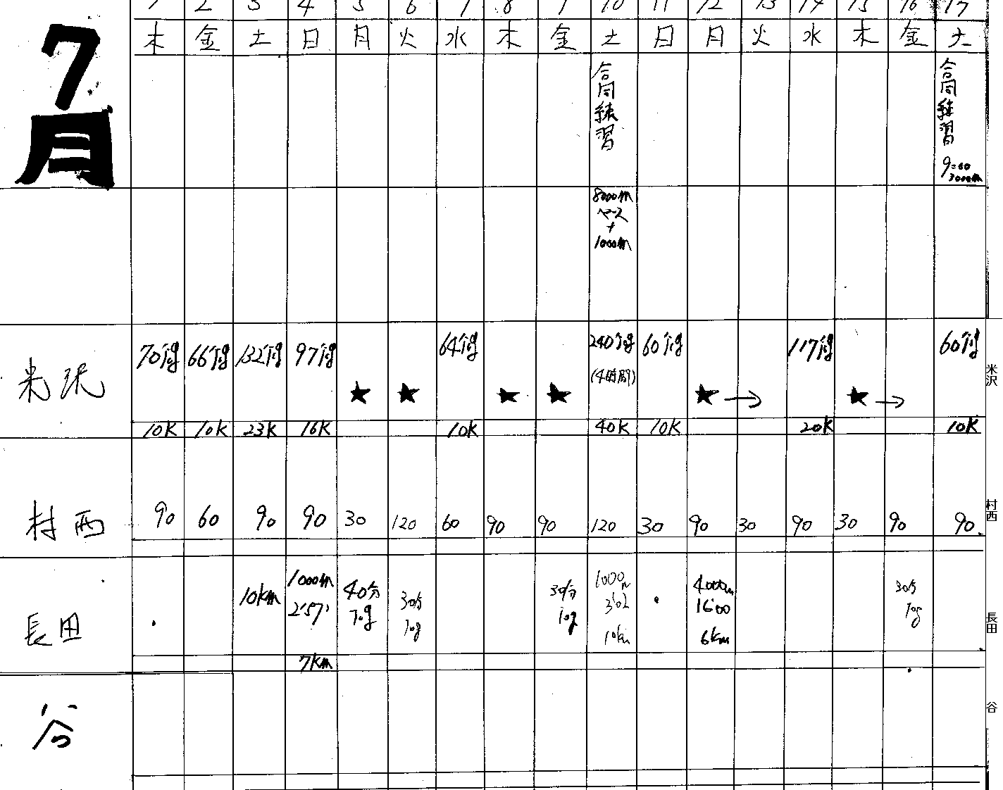 | 順位 | 選手 | 練習量 | 日平均 | 20km以上 | 備考 |