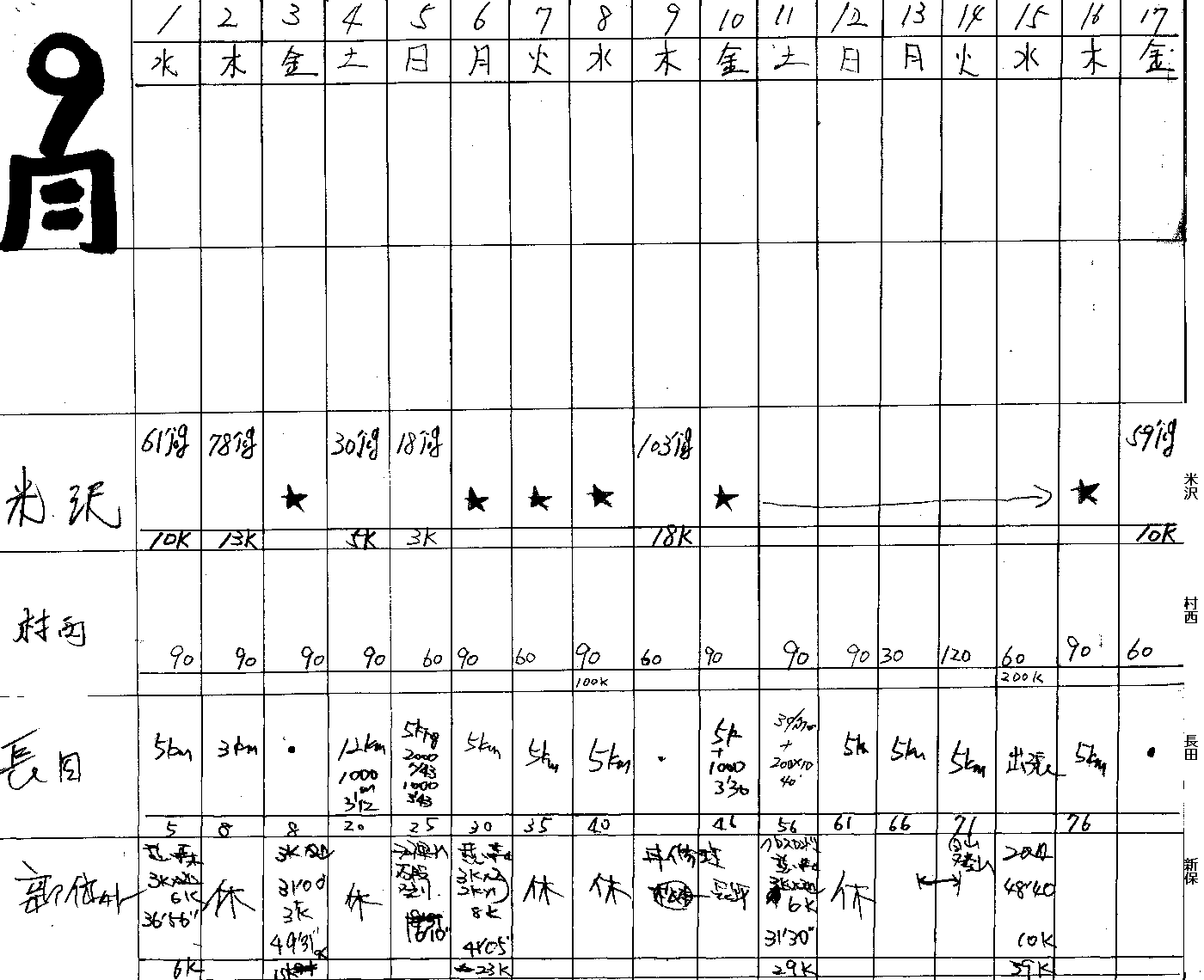 10.5km 42'44(4'04) 10.5km 41'49(3'59) 5000m19'15(3'51) 10.5km 41'20(3'56) 5000m18'50(3'46) 7.35km 32'13(4'23) 8.4km 33'32(3'59) 15km59'30(3'58) 10.5km 42'38(4'04) 15.75km 63'13(4'01) | 310km 右足付け根に痛み。歩けずで4日休み |