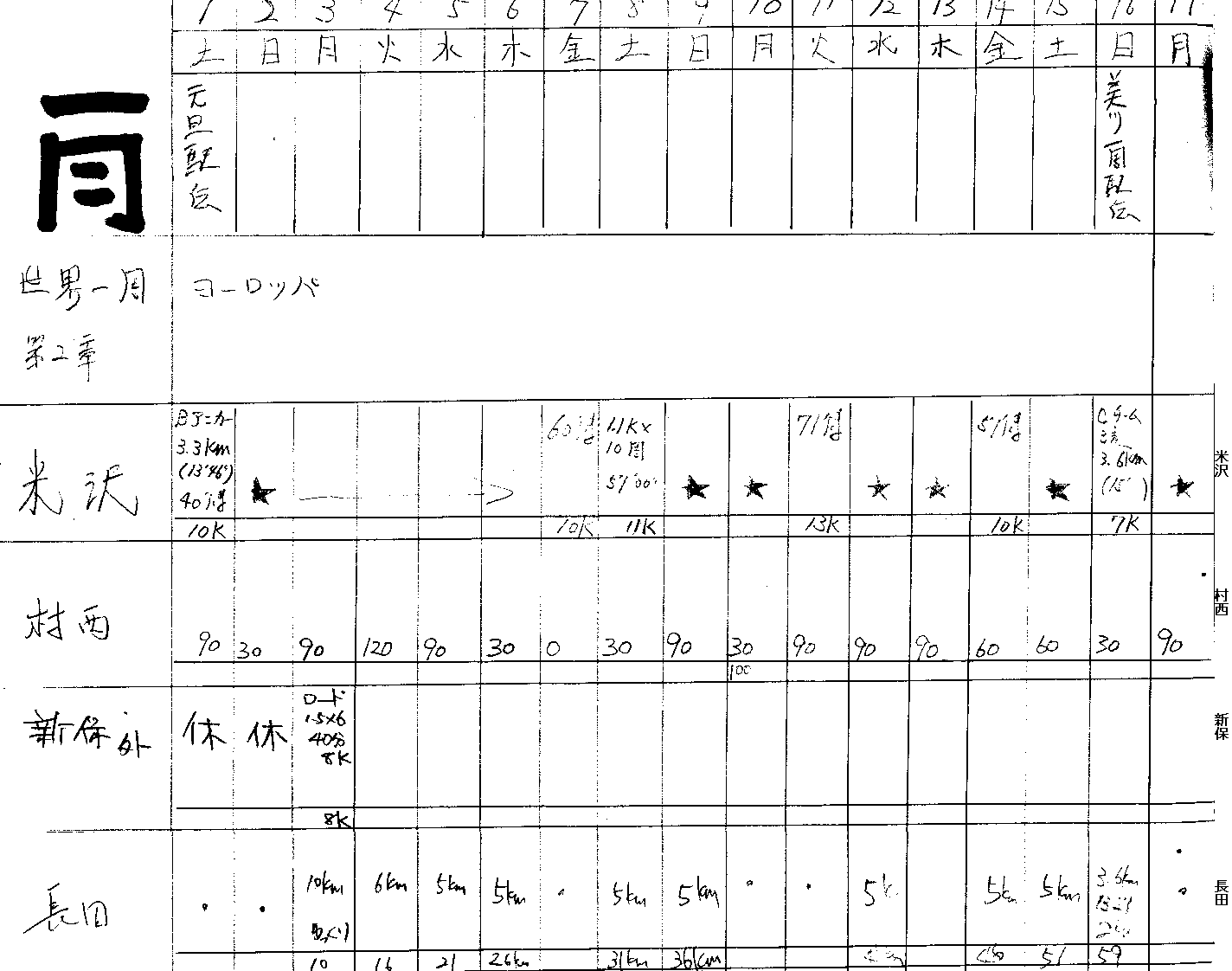 3万1:25'06(4'10) 10.5km45'52(4'22) 16.6km71'41(418) 25.5km101.34(359) 3万121'31(403) 15 km57'12(349) 22.5km91.47(405) 15 k58'39(355) 16.5km67'00(404) 7.5km31'18(410) | 531km |