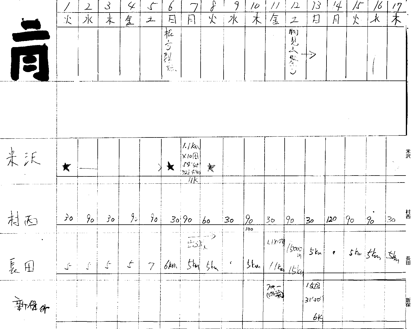 | 順位 | 選手 | 練習量 | 日平均 | 20km以上 | 備考 |