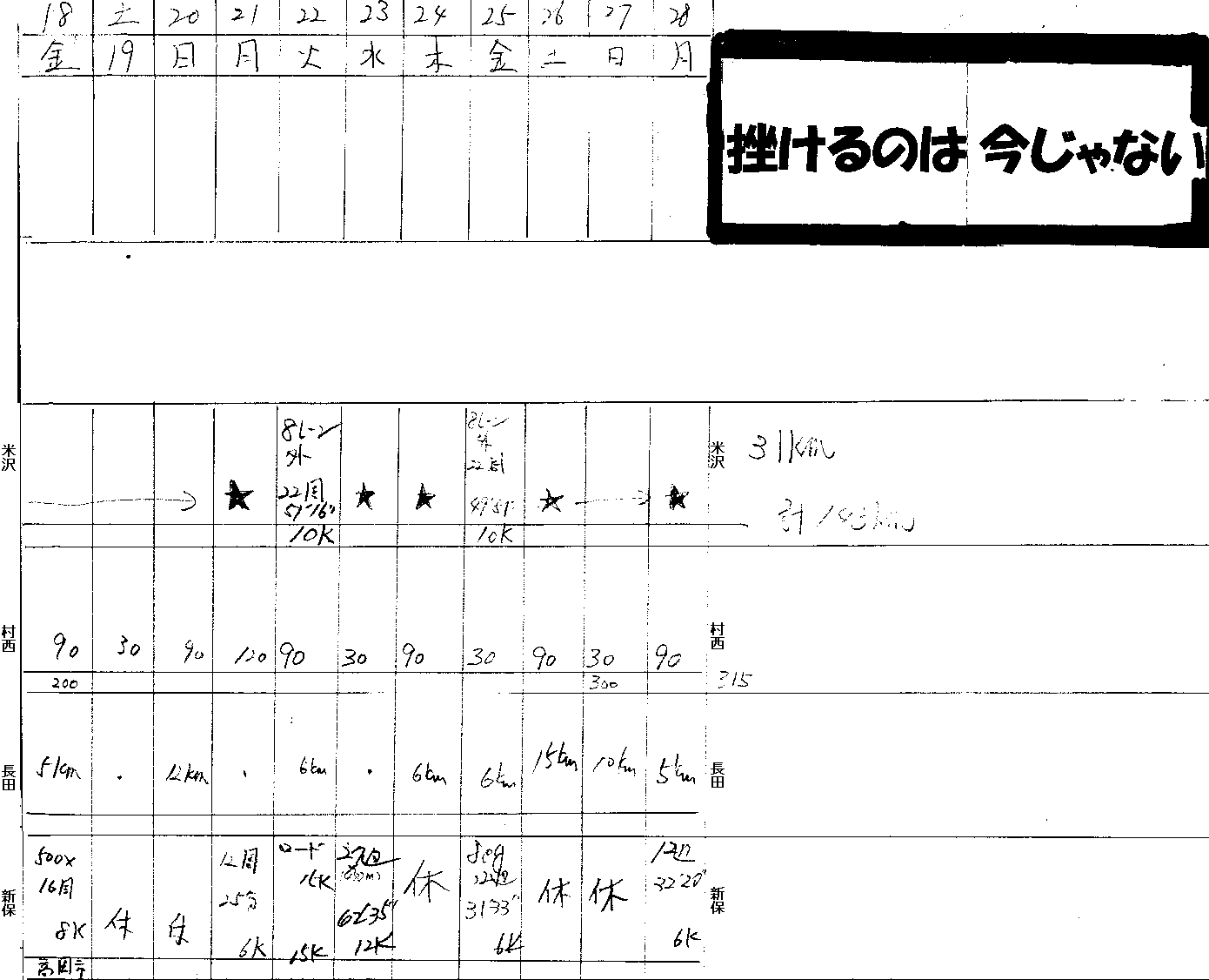 21km8242(356) 21km8358(400) 3万2:01'58(404) 15km5711(349) 3万2:02'05(404) 15k64'13(417) 12km4804(400) 21km8532(404) 30km2:02'42(405) 15km60'06(400) | 481km |