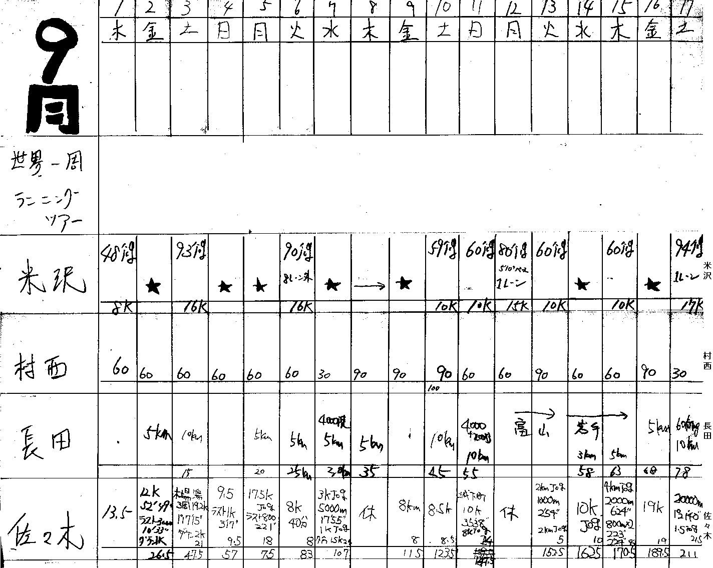 | 順位 | 選手 | 練習量 | 日平均 | 20km以上 | 備考 |
