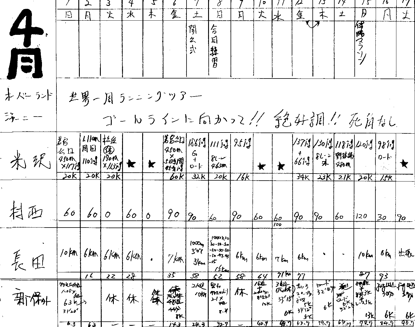 | 順位 | 選手 | 練習量 | 日平均 | 20km以上 | 備考 |