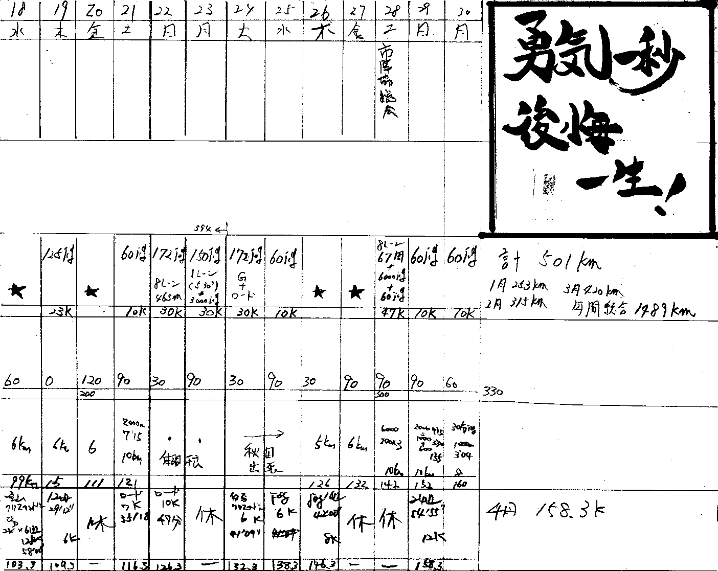 1000*5 3'32,34,35,35,28平均3'32.8 | 423km |