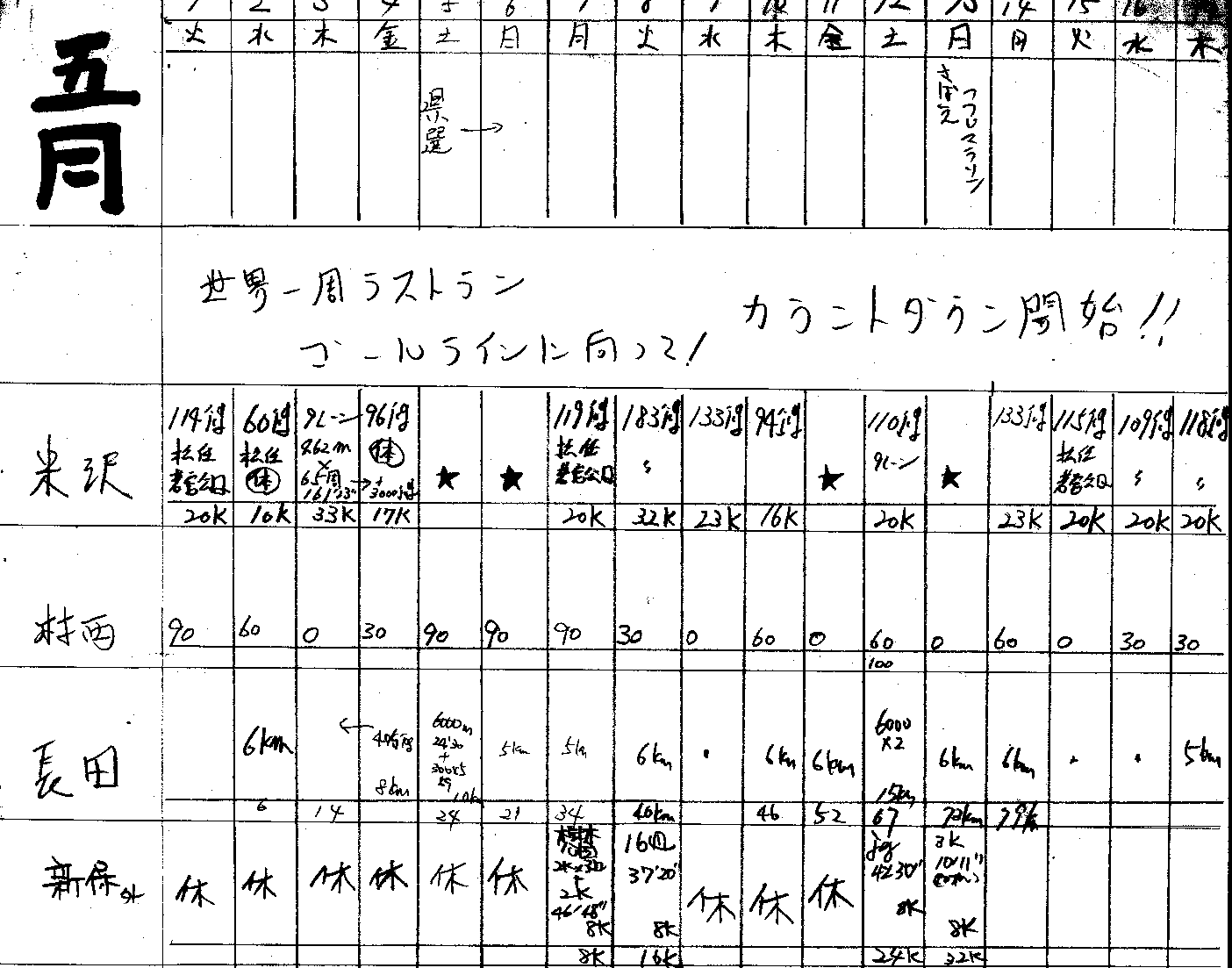 | 順位 | 選手 | 練習量 | 日平均 | 20km以上 | 備考 |