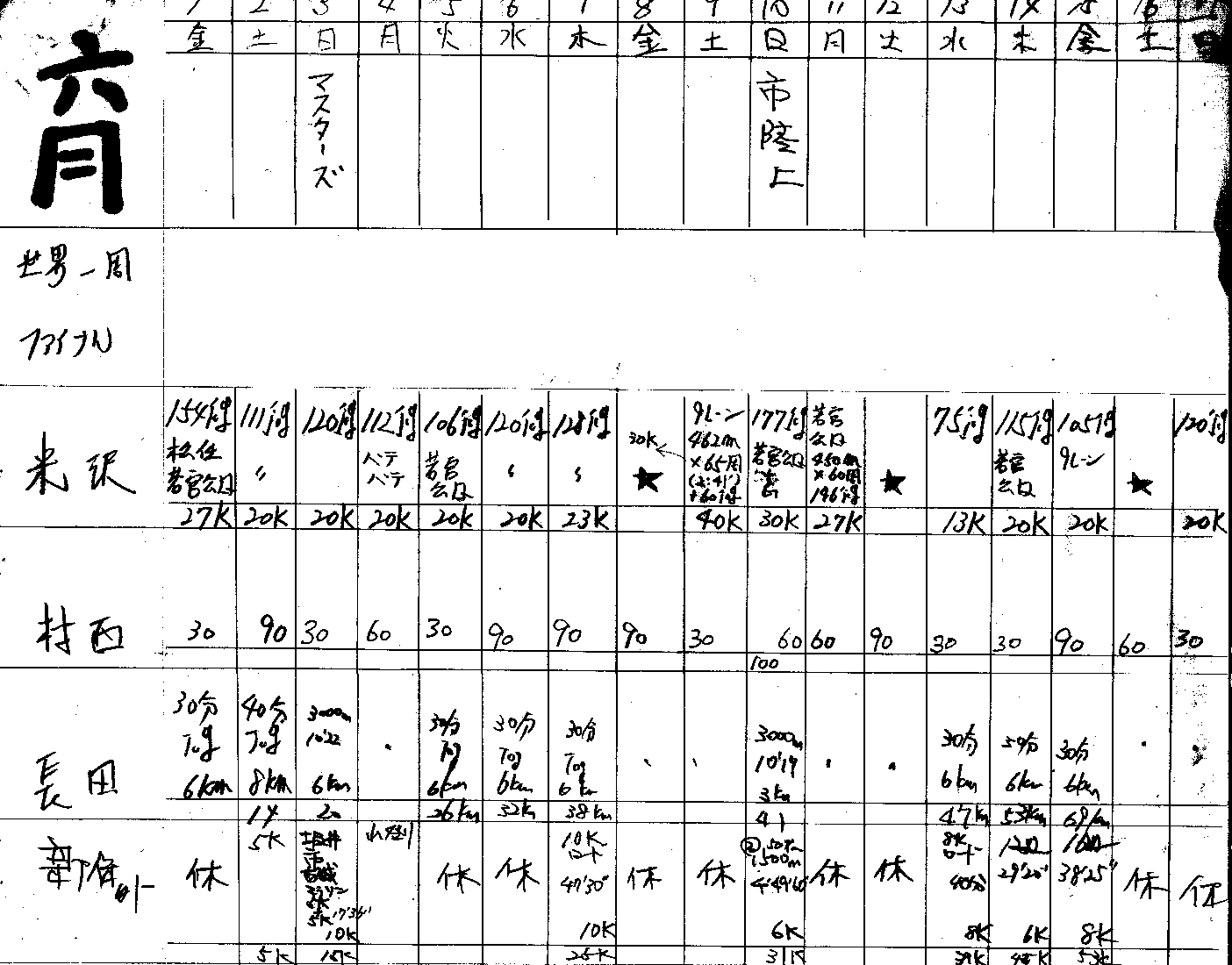 | 順位 | 選手 | 練習量 | 日平均 | 20km以上 | 備考 |