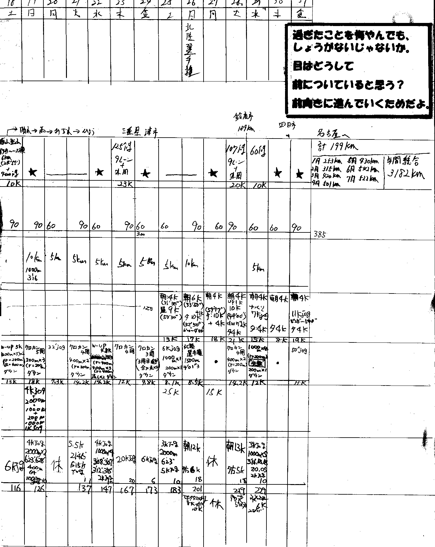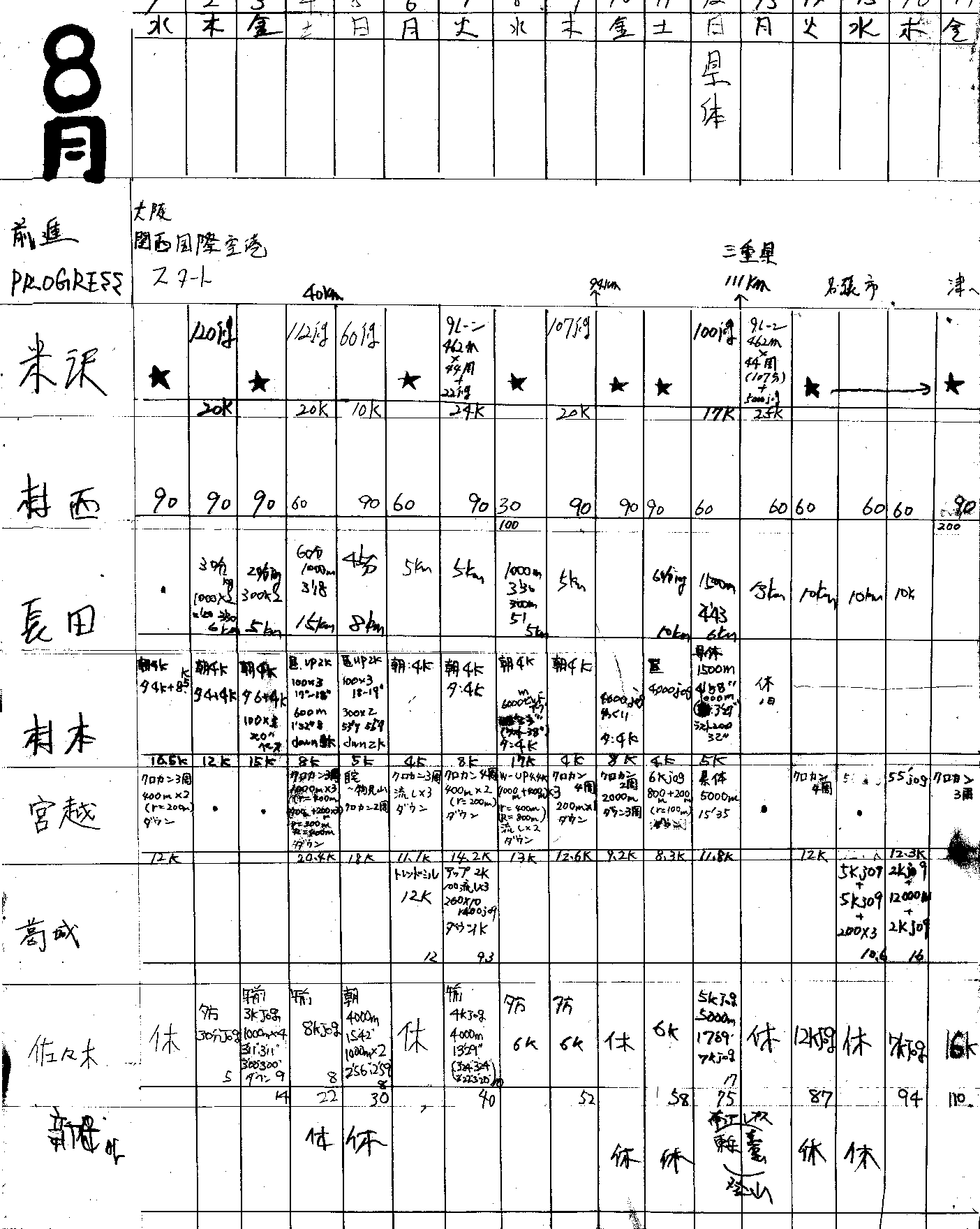 | 順位 | 選手 | 練習量 | 日平均 | 20km以上 | 備考 |