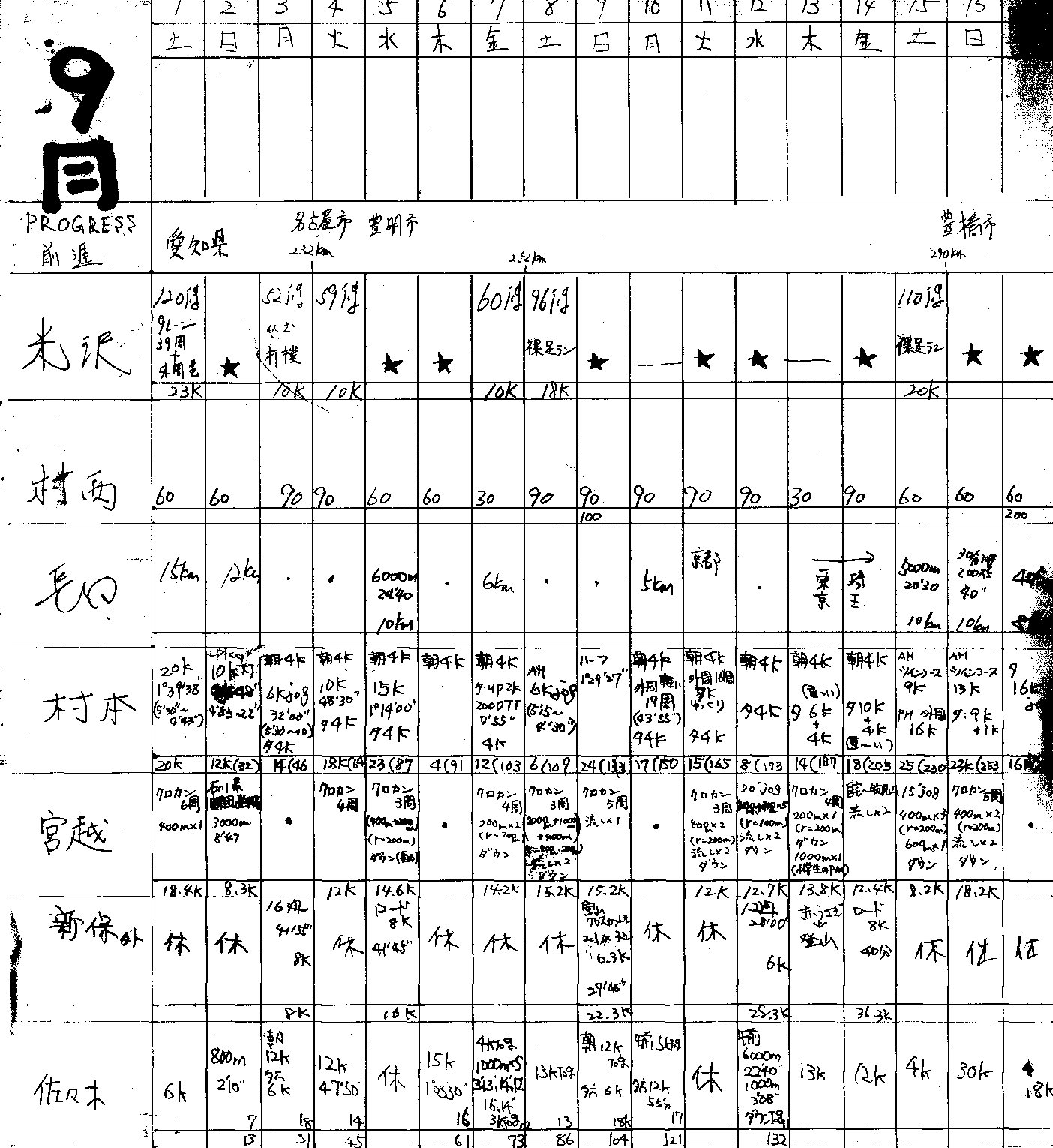| 順位 | 選手 | 練習量 | 日平均 | 20km以上 | 備考 |