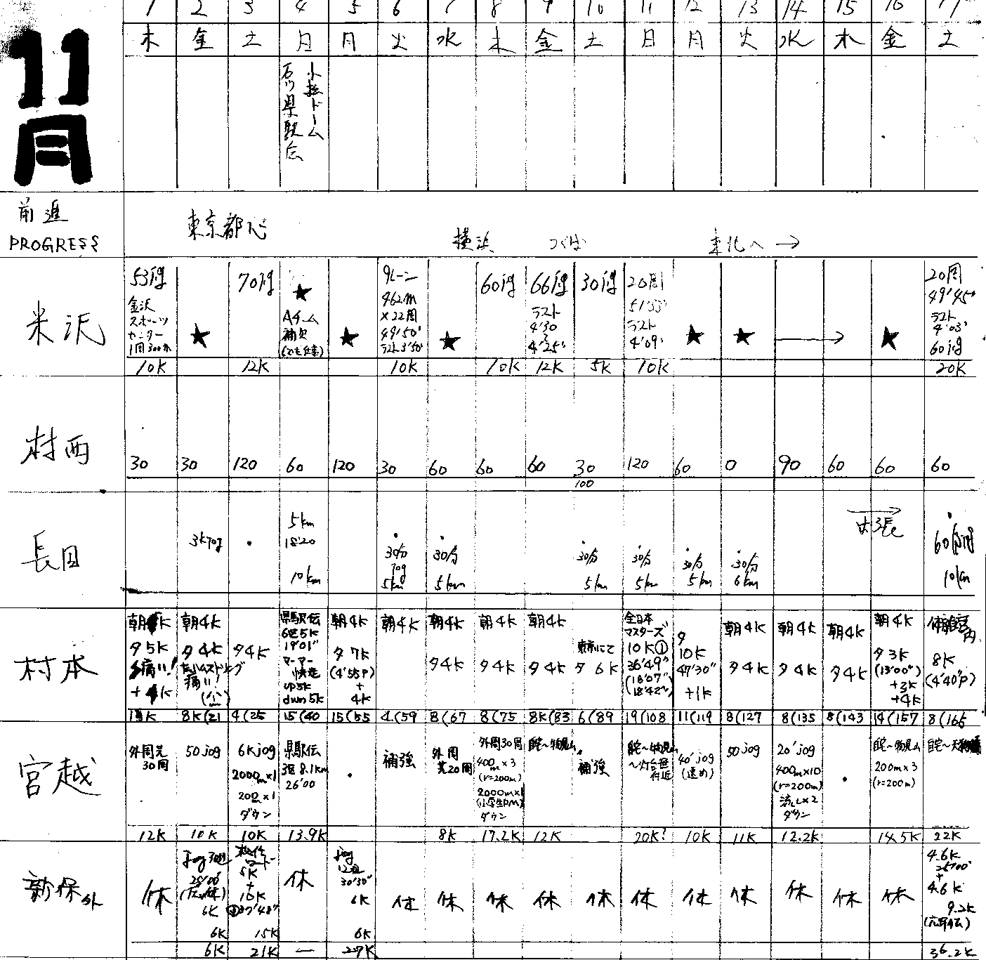 | 順位 | 選手 | 練習量 | 日平均 | 20km以上 | 備考 |