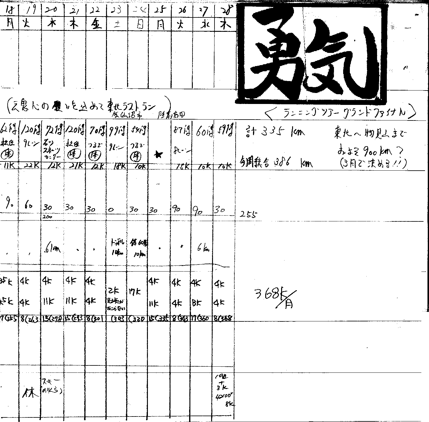 335km 年間総合386km 東北へ 物見山まてせおよそ900km? |