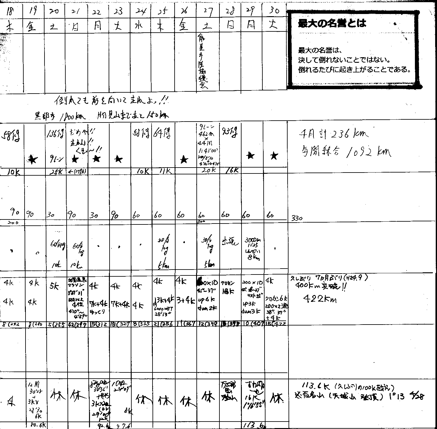 | 順位 | 選手 | 練習量 | 日平均 | 20km以上 | 備考 |