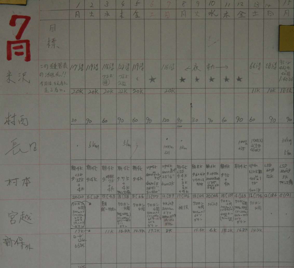 | 順位 | 選手 | 練習量 | 日平均 | 20km以上 | 備考 |
