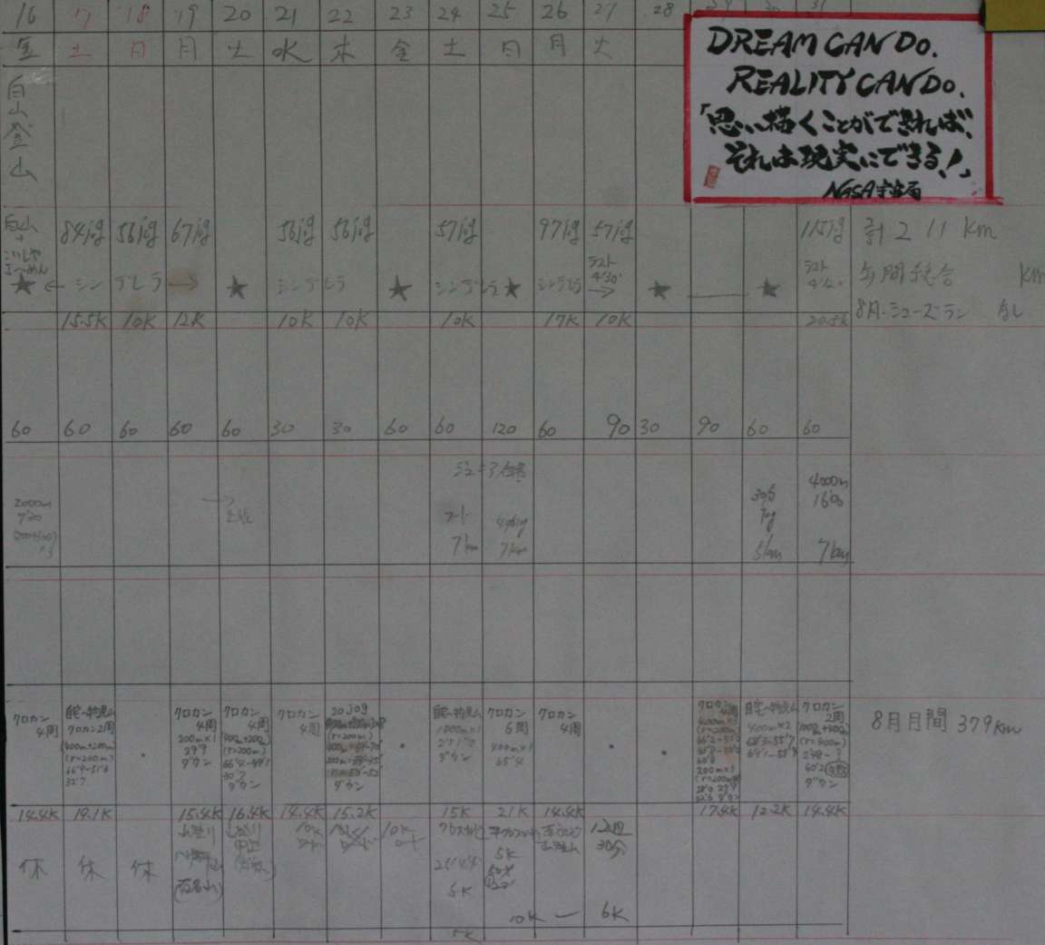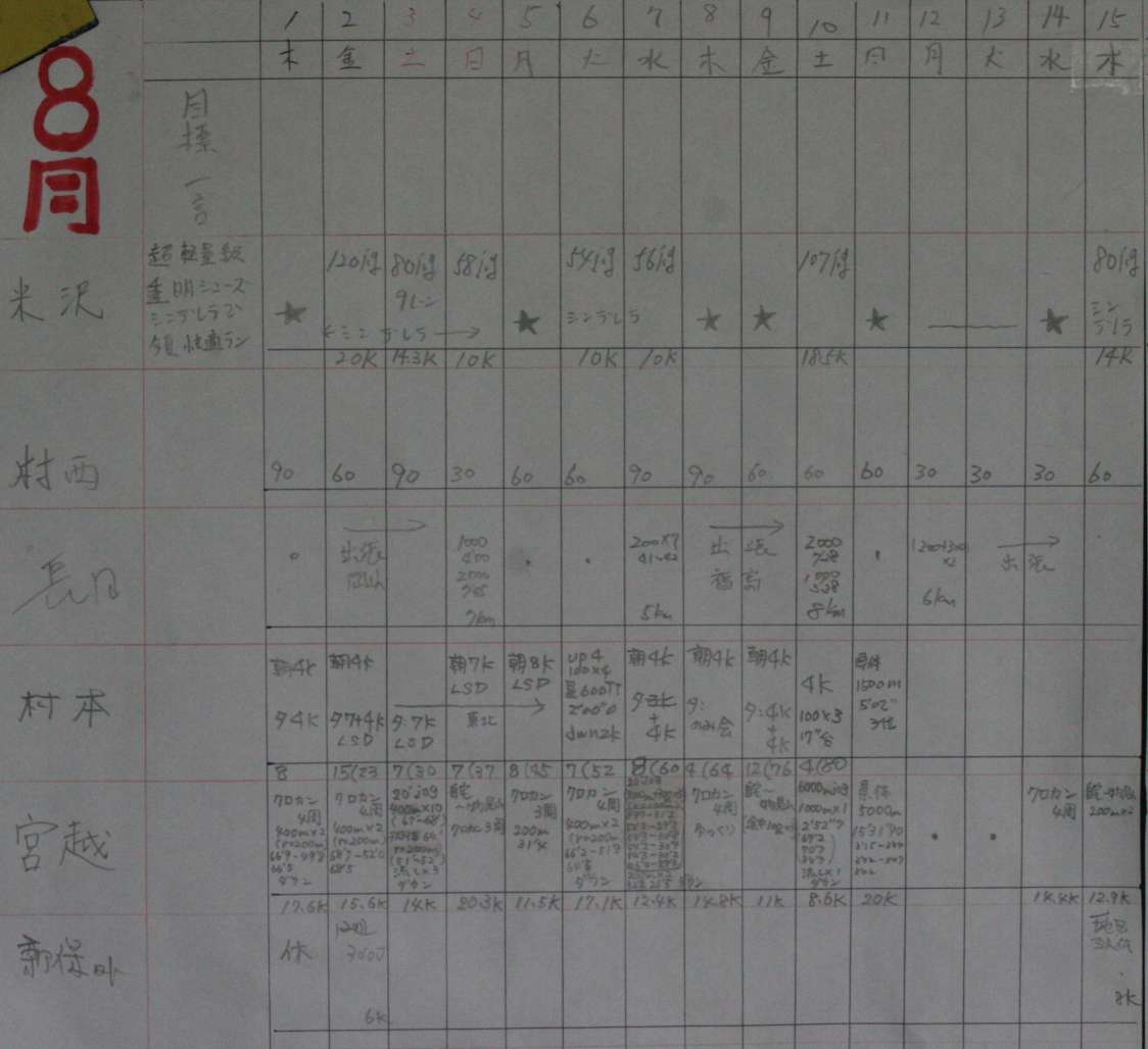 5000 15'31.90 3'15 4 2 7 2 | 200 31.4 200 29.9 400 65.4 1 2'52.7 67.2 70.7 34.7 1 2'51.0 | 400*2 r=200 66.9 49.8 66.5 400*2 r=200 68.7 52 68.5 400*2 r=200 66.2 51.8 64.5 400*2 68.3 55.7 69.1 51.9 400*3 r=200 200*3 r=200 66.2 51 63.8 53 66.8 28.0 27.9 32.6 4+2 r=200 66.9 51.6 32.7 4+2 r=200 66.4 49.1 30.7 4+2)*8 r=2 69-70 33-35 r50-52 200*10 r=200 67-68,64 r51-52 1000+400 r=400 2'48 60.2 3000+300*5 r=100 200*2 8'57 31.2 52.7 29.7 53.3 30.8 54.2 30.9 54.3 30.2 46.4 27.3 32.2 26.5 | 8月月間379km | ||