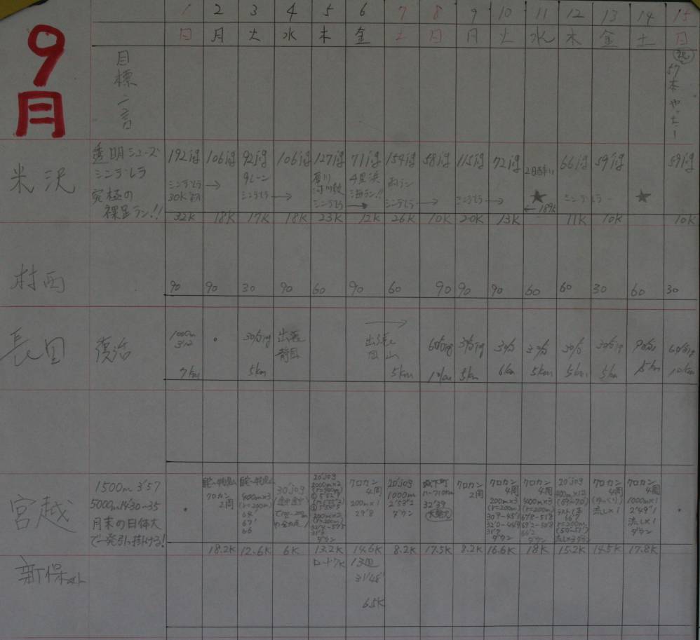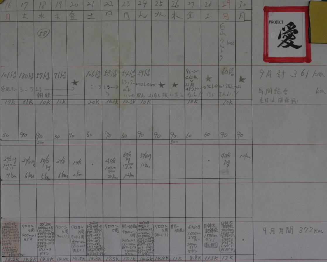 10k 32'39 1500 4'11 5千14'38.4 (2'54 55 54 54 59) | 200 29.8 1 2'53.2 1 2'49.1 400 63.8 1 2'58 | 400*3 r200 64 67 66 200*3 r200 30.9 45 32.0 45 31.7 400*3 r200 67.8 52 69.2 51 66.2 400*12 r200 69-70 66.7 r50-51 400*2 r200 64.3 52.8?計測ミス | 2*2 r400 +200*2 r200 5'52.9 1'55 5'54.5 32.4 57 31.3 1*5 r200 +200*2 r200 3'09.7 53.3 305.4 61.5 307.6 55.7 302.3 54.8 255.4 29.7 49.9 29.0 1*5 r200 254.0 50.8 257.4 51.8 257.6 52.0 258.3 52.3 254.5 3 300*5 r100 200*2 8'58 28.1 50.8 28.7 51.1 28.3 51.5 28.5 51.7 28.5 49.3 26.8 32.7 31.5 1*3+400*3 r400 R800 255.1 146.0 256.6 144.8 256.9 337.2 62.7 147.5 62.3 149.2 59.2 | 9月月間372km | |