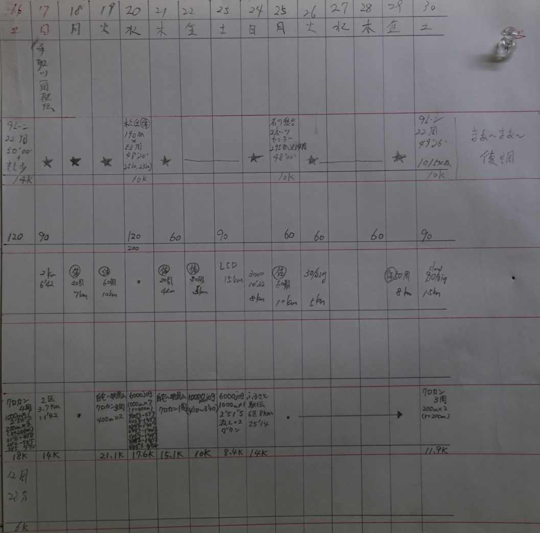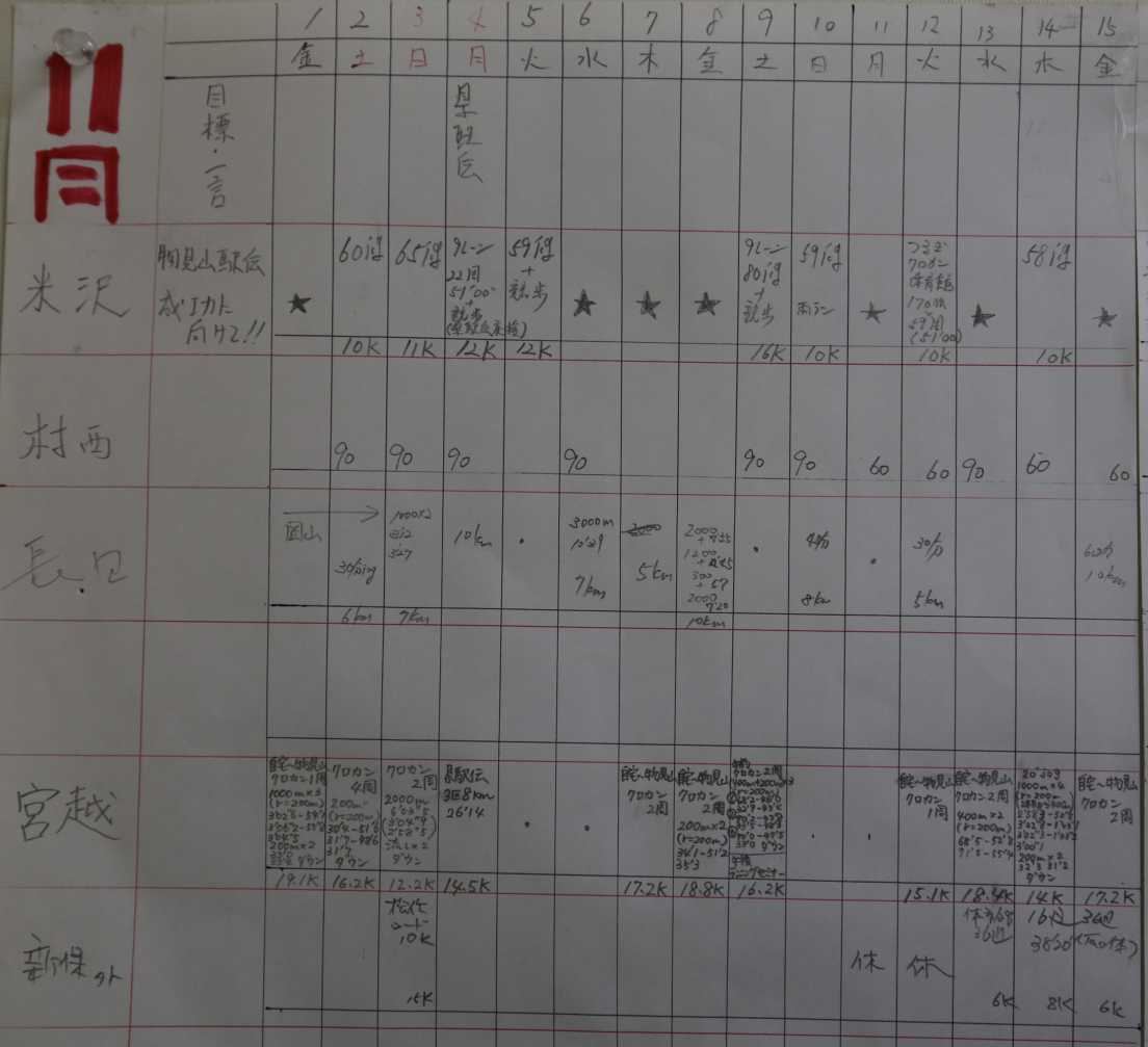 2 6'03.5 (3'04.9+2'58.5) 1万 4'10〜3'40 | 200*3 30.4 51.6 r200 31.7 48.6 31.7 400+200)*3 r200 68.2 46.0 32.9 47.4 70.2 47.8 33.5 48.3 70.0 47.5 33.0 200*2 34.1 51.2 r200 35.3 400*2 68.5 52.8 r200 71.5 55.4 400*2 200*2 | 1*3 3'02.6 54.1 r200 3'06.2 55'8 3'04.5 +200*2 33.0 33.4 1*4 2'58.3 52.8 r200 3'02.8 1'43.1 r400 3'02.3 1'43.2 3'00.1 +200*2 32.3 31.2 1 2'56.2 +200*3 31.0 49.8 r200 30.4 50.5 30.5 1*7 3'00.3 57.7 r400 3'03.8 1'47.3 3'04.6 1'45.1 3'03.2 1'44.6 3'06.7 1'49.5 3'08.2 1'47.3 3'05.1 | |