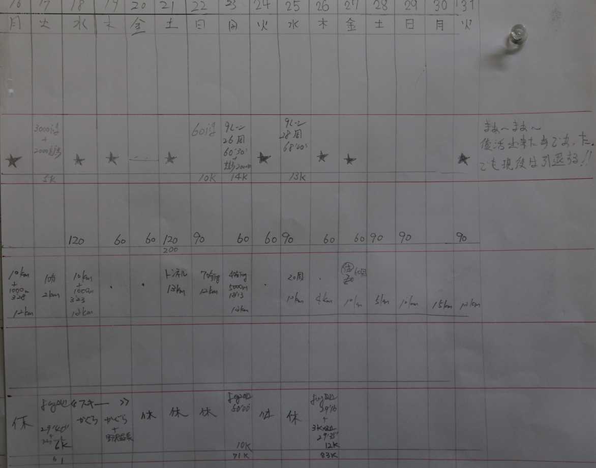 3.3km11'45 | 6km27'35(4'36) 6km27'55(4'39) 6.3km28'21(4'32/km) 7km32'56(4'42) 7km32'42(4'40) 8km34'51(4'21) 9km44'39(4'58) 9km41'14(4'35) 9km43'33(4'50) 9km41'46(4'38) 10km46'32(4'39) 10km45'26(4'33) 10km48'35(4'52) 10.3km44'40(420) 11km49'28(4'30) 12km61'31(5'08) 25km148'18(4'20/km) 30km126'58(4'14) 30km148'16(4'57) |