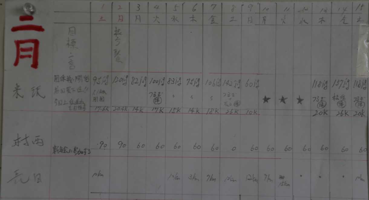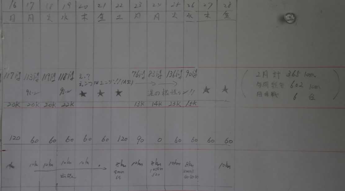 | 順位 | 選手 | 練習量 | 日平均 | 20km以上 | 備考 |