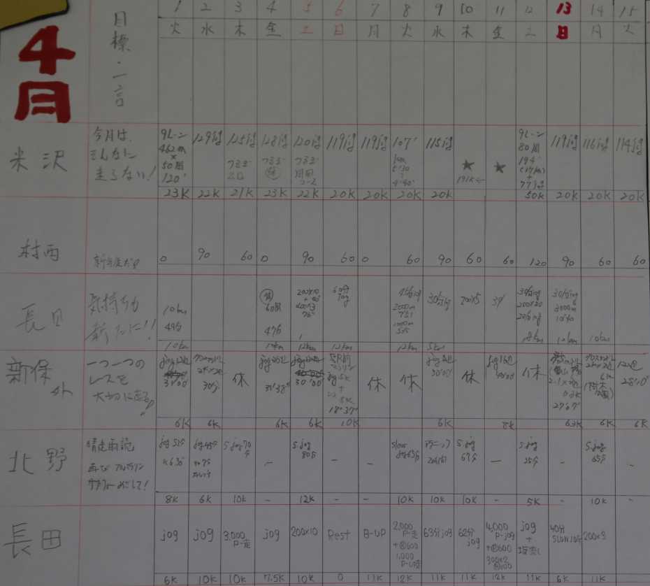 | 順位 | 選手 | 練習量 | 日平均 | 20km以上 | 備考 |