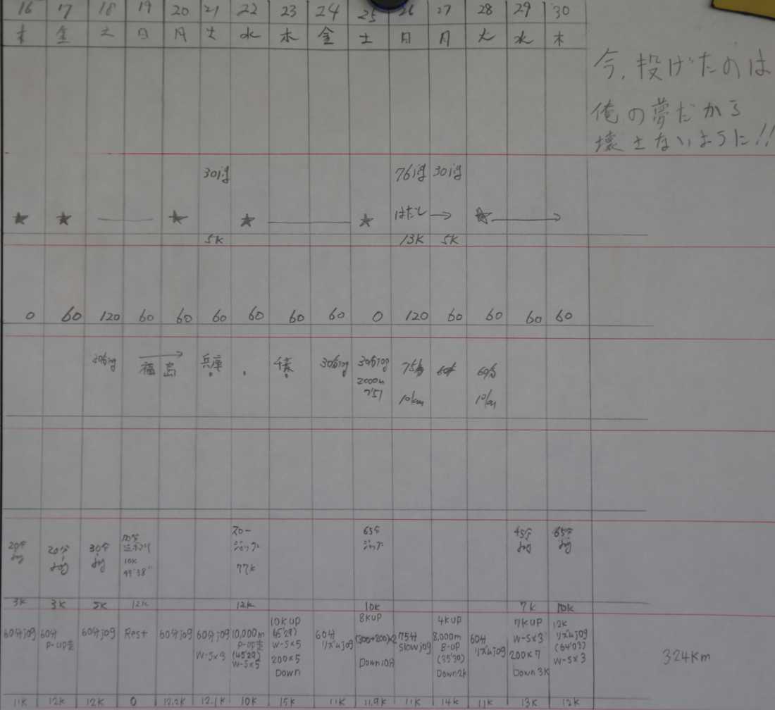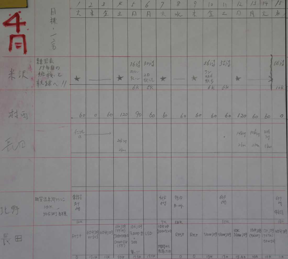 | 順位 | 選手 | 練習量 | 日平均 | 20km以上 | 備考 |