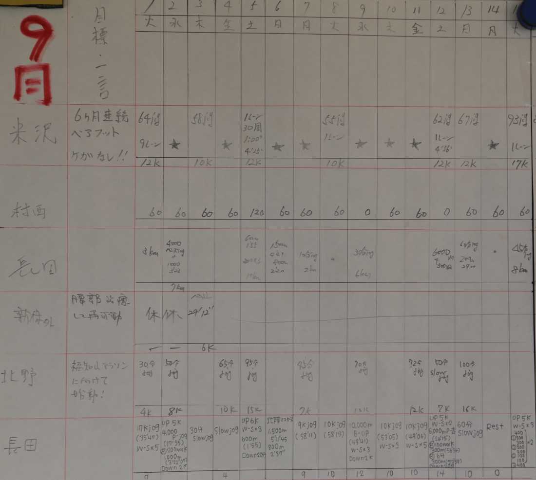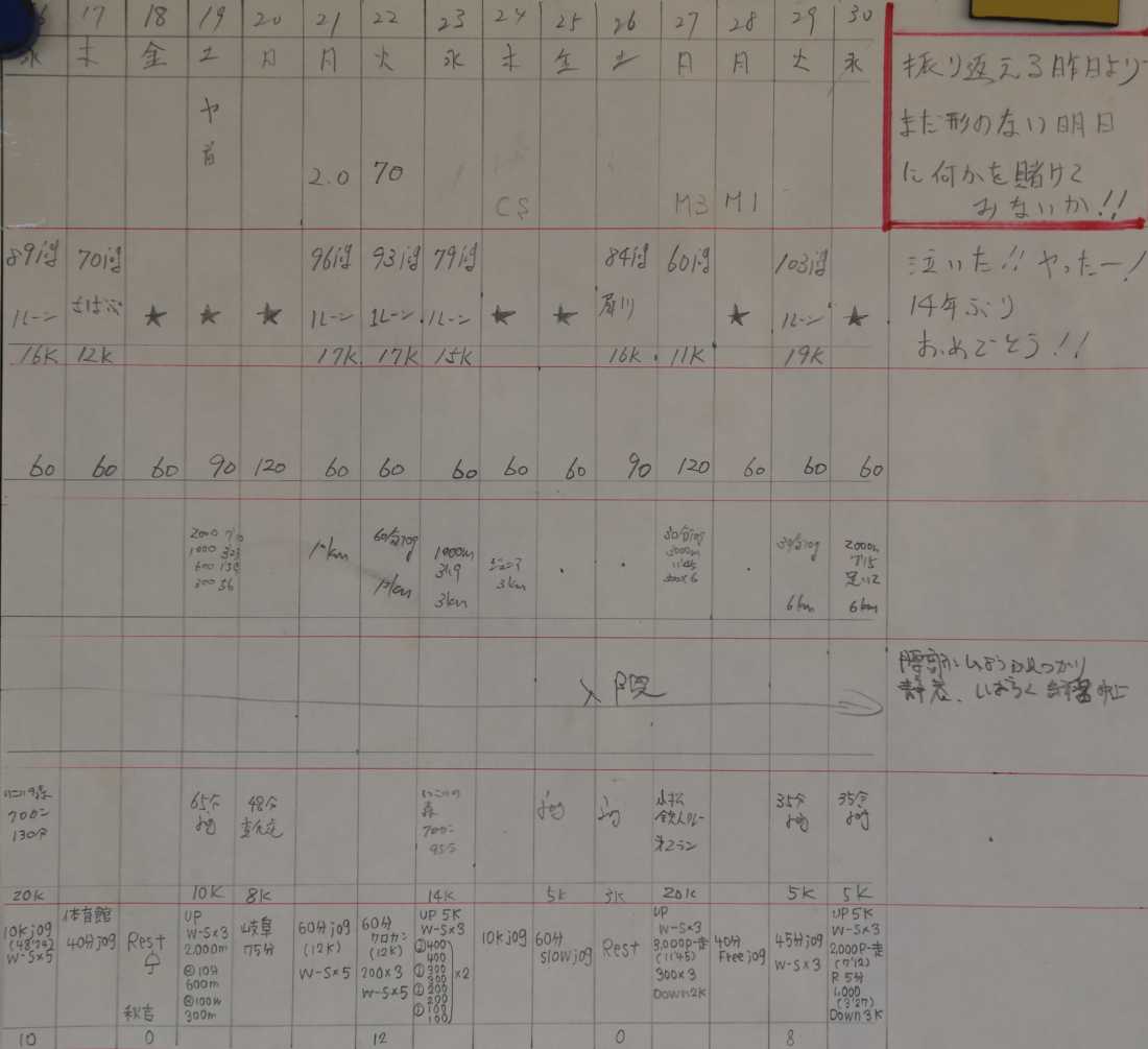 | 堂谷 | 8km36'34(4'34/km) 8.32km36'07(4'20/km) 8.32km37'40(4'32/km) 1万46'02(4'36/km) 10.0km42'24(4'14/km) 10.0km43'20(4'20/km) 10.0km44'09(4'25/km) 10.0km44'44(4'28/km) 10.0km45'15(4'31/km) 10.4km45'23(4'22/km) 10.4km45'53(4'25/km) 10.4km47'32(4'34/km) 10.4km47'32(4'34/km) 10.4km47'51(4'36/km) 10.58km46'02(4'21/km) 11.44km49'25(4'19/km) 12.0km54'31(4'33/km) 14.6k67'13(4'37) 20.8km96'10(4'37/km) 30km136'00(4'32/km) |