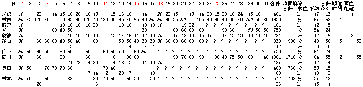 | 順位 | 距離 | 日平均 | 20km以上 | 時間 | 日平均 | 100分以上 | ||||