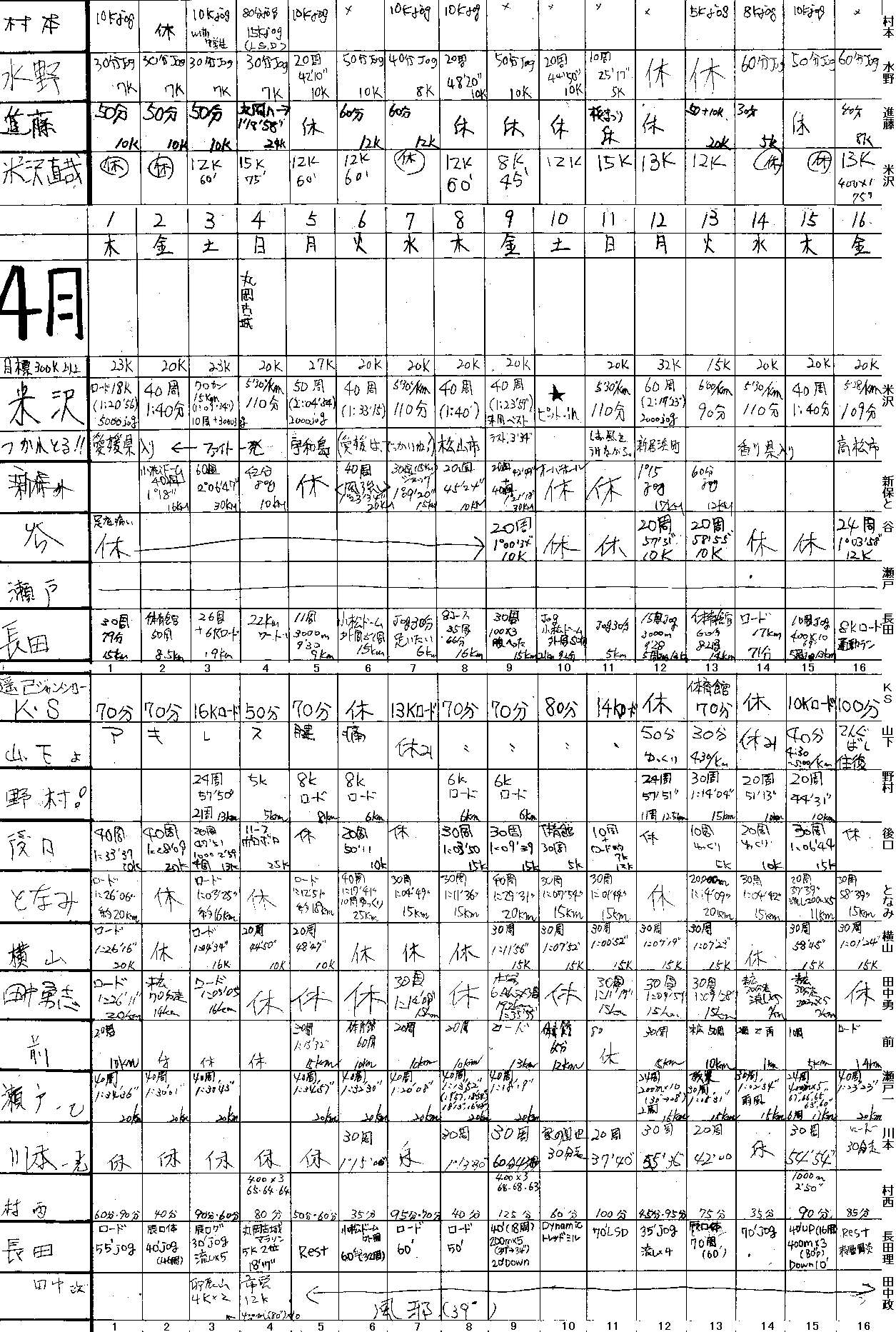 | 堂谷 | 1500 4'35.8 3000 9'36.4 | 400*20 : 75〜67 | 1000×5+200jog:3'11,10,13,11,12 |