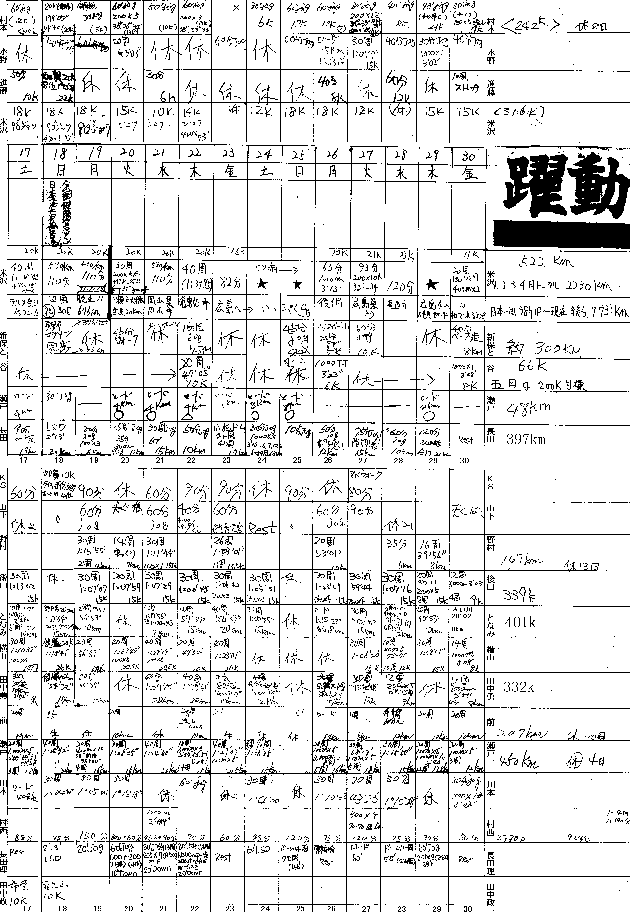 | 順位 | 選手 | 練習量 | 日平均 | 20km以上 | 備考 |