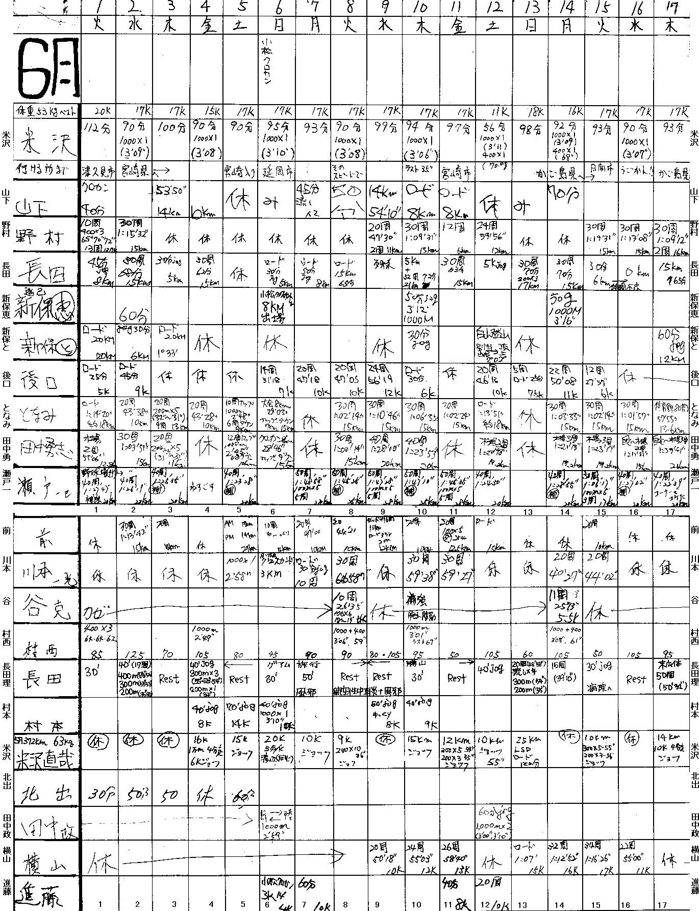 | 川本 | 3k : 12'53 | 1: 2'58 | 200×10 :35〜36 | ||