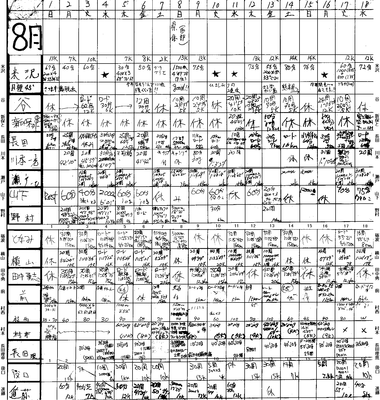| 谷 | 1: 3'15 | 1000×3:3'35〜37 1000×3×2:3'36〜41,3'24〜28 |