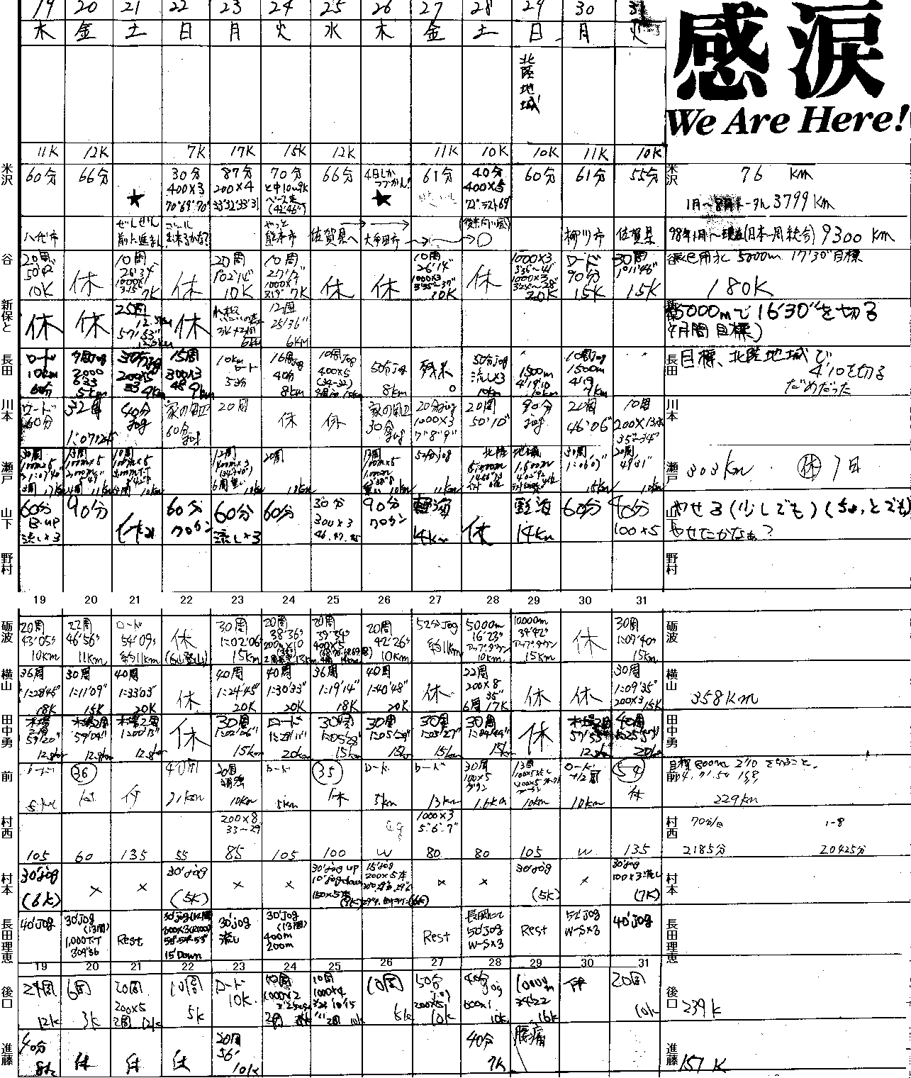 | 順位 | 選手 | 練習量 | 日平均 | 20km以上 | 備考 |