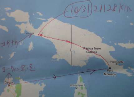 現在地ー パプアニューギニア島コケナウまであと20km手前地点 |