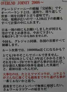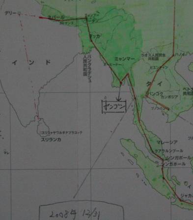 | 12月 | 今月1796km 12月29日 総合距離ー24579km 現在地ーミャンマー さて早いもんですね。あれから(スタートしてから)一年ですよ 一年終えての感想ですが、まず。。。。。。。。。。。特にないです^^。。。。。 なんでまだそんな所なん?・・ と思いでしょうが世界なんてそう甘くないです。確実にいえる事は、3年で達成はまず100パーセント不可能です。 やると言った以上は何年かかろうと実行するのでとにかくワシントンまで行こうぜ! 今年最後に一言 当初にも言いましたが、こんな企画は一年ぐらい過ぎるとどうでもよくなったり忘れ去られてしまうケースがほとんどです。しかし一年通じてきちんと毎月距離報告してくれた仲間たちに感謝します。2年目もヨロシクお願いします。 27シンガポール 28マレーシア通過 |