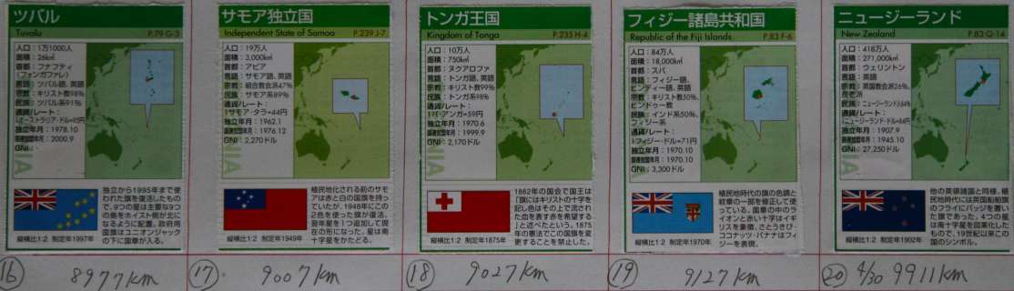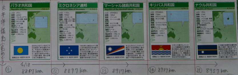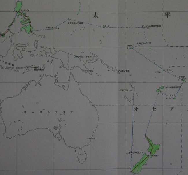 | 4月 | 今月2511km 総合9911km 南シナ海・パラワン島からフィリピン(マニラ)〜セスナ機チャーターして、パラオ〜ミクロネシア連邦〜マーシャル諸島〜キリバス〜ナウル〜ツバル〜サモア〜トンガ〜フィジー島〜ニュージーランド。。。。。 4月30日、ニュージーランド。めでたい事にこのニュージーランドでちょうど20カ国目。 南シナ海に点々とする小さな島々はおよそ平均15km〜20kmで計算してあります。もちろんセスナ機で移動する海上の距離は計算に入れてません。 ルート表 11パラオ、12ミクロネシア、13マーシャル、14キリバス、15ナウル 16ツバル、17サモア、18トンガ、19フィジー、20ニュジーランド |