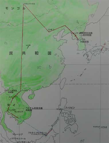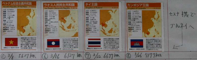 | 3月 | 今月2454km 総合7400km 3月8日ー5627k(ベトナム、ハノイ) 3月16日ー6127k(ラオス、ビエンチェン) 3月22日ータイ、バンコクー6677k 3月26日ーカンボジア、プノンペン (プノンペンからセスナ機をチャーターしました。) セスナで南シナ海をまたいで、ブルネイー首都は、バンダルスリブガワン、そこからマレーシア島を少し縦断してさらにセスナ機で、パラワン島に上陸! 5ベトナム、6ラオス、7タイ、8カンボジア 9ブルネイ |