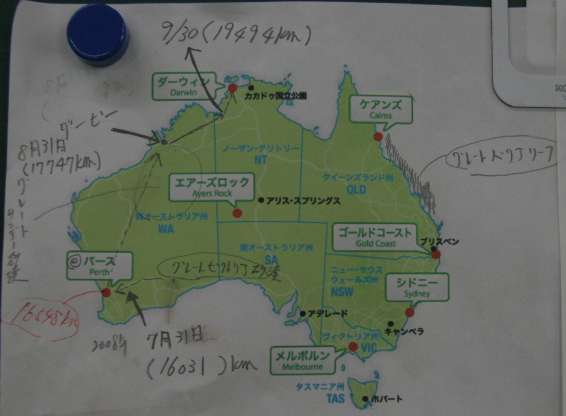 | 9月 | 今月1747km 総合19494km 9月30日 長いですね?と言うか、さすがに広いです。間違いなく今日もしくわ明日、あさってにはオーストラリア脱出出来ます。 オーストラリア一周約8800km(4ヶ月以上かかってます) ここまで来ると距離が合ってるのか?少し疑問に感じますが、短い事はあっても実際よりも長い事はまずありません。あくまでも直線距離で計算。。。。道なりならまだまだオーストラリア制覇は、程遠いと言うことになります。 この先進路は、ダーウィン空港〜パプアニューギニア島へと旅立ちます。 ダーウィン空港が目の前に迫ってるので、迷子がいないか点呼取りたいと思います。 プロジェクトチームー米沢1、堂谷、村西、長田、新保、谷、中村、出海、米沢2、北川、以上全員いますね?んん???? 故障者多いですが、自分は、足手まといなんてこれっぽっちも、思ってません。別に休んでもいいし、無理に走らなくても全然かまわないと思います。ようは、最後まで10人そろってワシントンDCのホワイトハウス(レッド絨毯を走れれば、その日まで走っていられる体でいてくれれば十分です。) 一日、1kmでも走れば距離に加算します。ただし15km歩いたとしても距離に加算しません。 それでは、オーストラリア大陸に別れを告げて旅立ちます。 明日に向かってテイクオフ |
