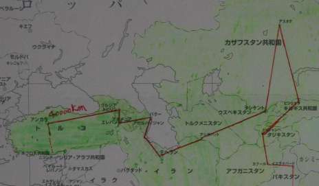チームの総合(4月)2360km 世界一周総合35014km 4月30日付け更新です。 個人の距離ー出海384k、堂谷354k、中村337k、北川293k、米沢直285k、村西240k、長田221k、米沢143k、新保55k、谷48k さて前回進路は、未定のままで終えてると思いますが、誰かシュミレーションされた人いるでしょうか? いない、もうどうでもいい?関心がない、一人でやっとれ!なんかそんな声が聞こえてきそうな今日この頃ですが。。。。。 行きますよ、いいっすか! えぇーと、どこや?。。。パキスタン(イスラマーバード)32654km〜アフガニスタン(カーブル)33054km〜タジキスタン(ドゥシャンぺ)33504km〜キルギス(ビシュケク)34204km〜北上してカザフスタン(アスタナ)へ向かう途中です。 37アフガニスタン、38タジキスタン、39キルギス |
