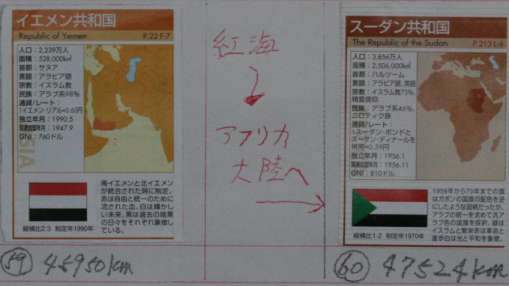 9月30日付け更新 チーム合計2537km 世界一周総合ー47524km 個人距離ー出海518km、米沢(直)376km、堂谷349km、北川272km、 中村327km、村西300km、長田254km、新保102km、米沢31km、谷8km 出海さんの一日の練習距離が、偶数より奇数が多くなるのは自分には気持ちよくわかります。さて、なぜでしょう? 先月、オマーン〜イエメン(サヌア)へ向かう途中で更新が終えてると思います。ちょっと計算ミスでイエメン(サヌア)まで、あと1600kmあります。 と、いう事でイエメン(サヌア)45950km〜メッカ46850km〜アラブ首長国連邦に別れを告げて。。。。紅海をまたいでやっとアフリカ大陸上陸ダー^^イェイ^^イェイ^^イェ〜イ^^盛り上がれー。で、アフリカ大陸、ジェッタ〜スーダン(ハルツーム)47524kmです。 59イエメン,60スーダン |